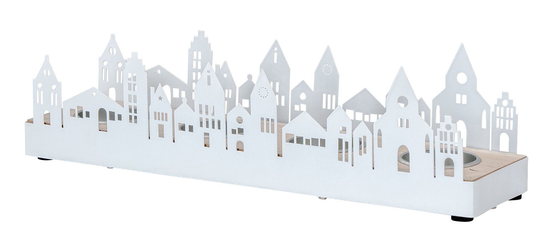 Mit dem trendigen Haus-Silhouette-Motiv ist dieser Kerzenhalter nicht nur Deko – er ist der Hingucker schlechthin! Perfekt dekoriert in einer herbstlichen oder weihnachtlichen Kulisse wird diese Kerzendeko zum Eyecatcher. Durch die Kombination aus weißem Metall und naturfarbenen Holzelementen lässt sich die Tischdekoration in jeglichen Einrichtungsstil integrieren. Durch die eingelassenen Halter für insgesamt 4 Teelichtkerzen kann die Kerzendeko auch als Adventskranz zur Weihnachtszeit genutzt werden. Sobald die Kerzen eingesetzt sind, wirft der Teelichthalter einen träumerischen Schatten einer (Alt-)Stadt auf seine Umgebung.