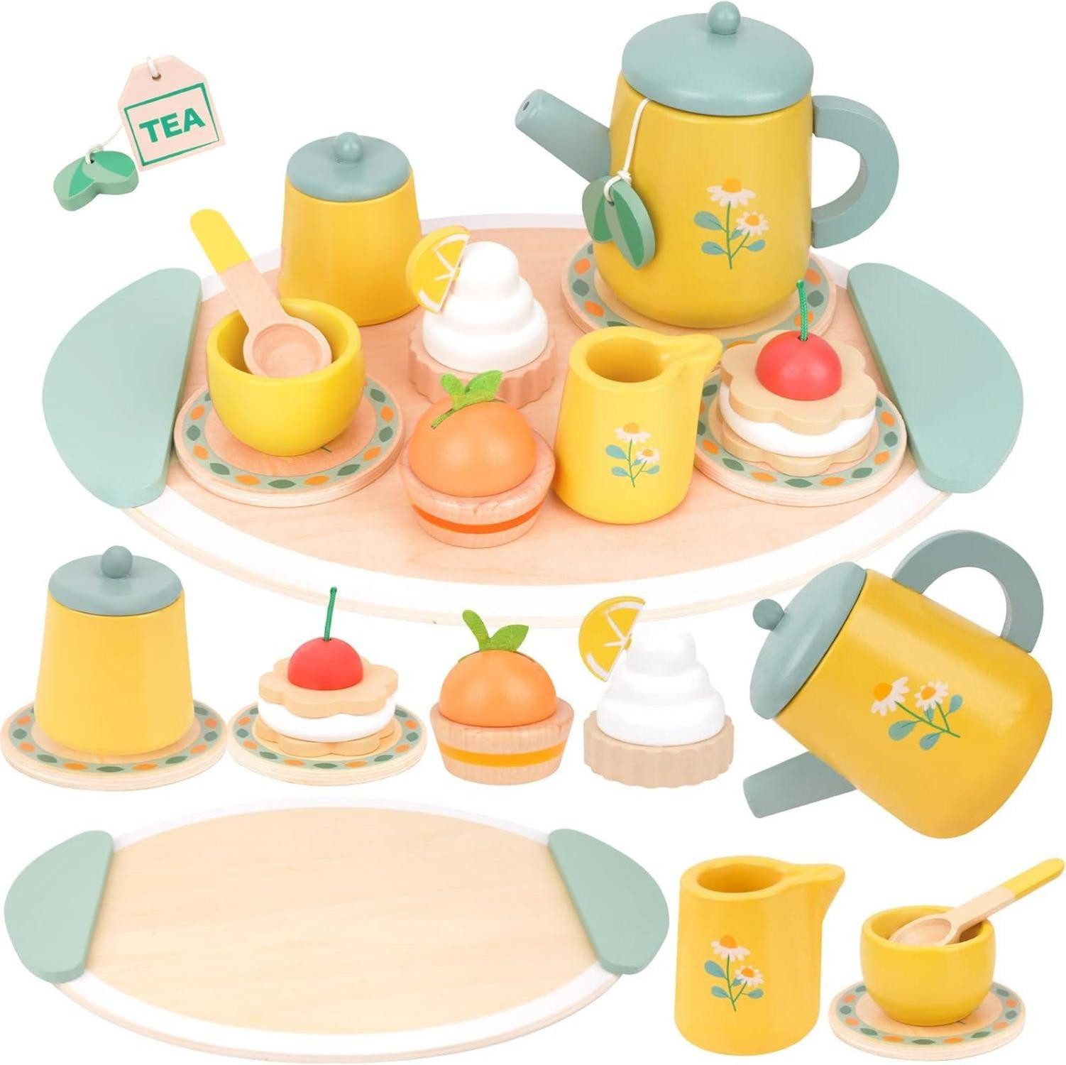 Ideale Geschenke für Kinder - Großartiges Geschenk für ein kleines Mädchen, um Teeparty zu spielen, einfaches und niedliches Holzspielzeug für Kleinkinder im Alter von 3, 4, 5, 6, 7 oder mehr Jahren. Sie werden es gerne zu ihrem Geburtstag, Ostern, Kindertag, Weihnachten usw. erhalten. Hochwertiges Küchenzubehör - aus natürlichem Holz gefertigt und mit Farbe auf Wasserbasis überzogen. Das Spielküche Zubehör Holz mit glatten Kanten sind freundlich zur zarten Kinderhaut. Machen Sie sich keine Sorgen, wenn Ihre kleinen Freunde Dinge herumwerfen, denn die Holzteile sind sehr stabil. Pädagogisches Montessori Holzspielzeug - Die hellen und gedeckten Farben fallen den Kindern auf den ersten Blick ins Auge und regen die Fantasie an. Das Rollenspiel schafft ein interessantes Szenario, in dem sich die Kinder entspannen, beruhigen und auf soziale Interaktion und Feinmotorik abseits des Bildschirms konzentrieren können. Genießen Sie die Zeit der Teeparty - das Kinderküche Zubehör Holz hat die perfekte Größe, um es mitzunehmen. Kinder können ihre Schürze oder ein hübsches Kleid anziehen, um Tee zu kochen, Milch und Zucker hinzuzufügen und das Dessert mit ihren Puppen, Freunden oder Eltern zu genießen. Das ist eine gute Gelegenheit, Tischmanieren zu üben, soziale Fähigkeiten zu verbessern und die Eltern-Kind-Bindung zu stärken. Teeservice Kinder - Kleine Mädchen und Jungen werden das Kinderküche Zubehör mit vielen Details lieben. Es enthält 1 Tablett, 1 Teekanne, 1 Löffel, 1 Zuckerdose, 1 Milchkännchen, 1 Teetasse, 1 Teelöffel, 3 Untertassen, 1 Teebeutel, 2 Kuchen und 1 Keks Das komplette Set mit Küchenzubehör wird Kindern viel Spaß beim Spielen bringen.