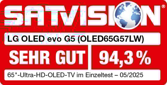 Das Testmagazin „SATVISION“ prüft die LG OLED evo G5 Reihe (LG OLED65G57LW) im Einzeltest. Das „exzellente“ Bild überzeugt u. a. mit „herausragender“ Spitzenhelligkeit, top Entspiegelung und einem großen Betrachtungswinkel. Auch der Ton ist „sehr gut“. Die Bedienung ist sehr einfach. Der TV hat ein elegantes Gallery-Design. Außerdem punktet die umfangreiche Ausstattung z. B. mit HDR10, HLG & Dolby Vision, Dolby Atmos und einer „lückenlosen“ App-Unterstützung. Der 4K-OLED-TV erreicht das Testurteil „SEHR GUT (94,3 %)“.
