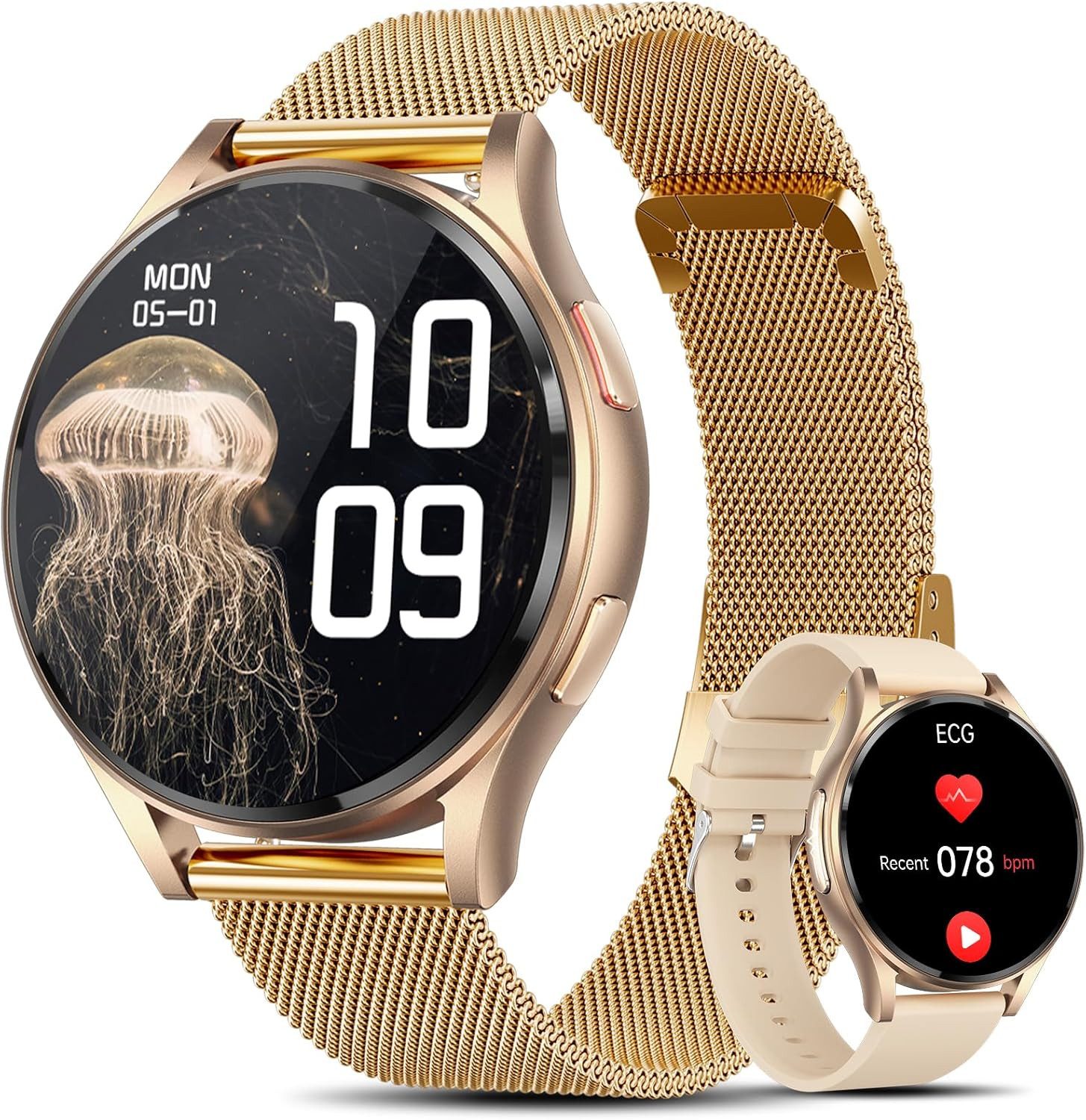 Die Damen-Smartwatch überzeugt mit einem 1,43-Zoll-AMOLED-HD-Farbdisplay, Always-On-Funktion und zwei Armbändern: elegantem Milanaise-Stahlarmband und flexiblem Silikonband.