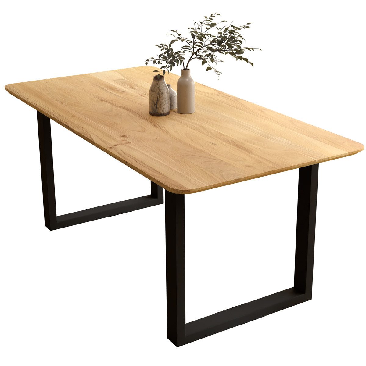Der Gubio Esstisch ist in zwei praktischen Größen erhältlich: 160 x 85 cm für kompaktere Räume oder 180 x 90 cm für großzügige Essbereiche. Auch optisch haben Sie die Wahl – zwischen einer natur lackierten Tischplatte mit warmer Holzoptik oder einer schwarz lackierten, sandgestrahlten Варианты mit markanter Oberfläche. Beide Вариантыn sind aus massivem Akazienholz gefertigt und bringen die natürliche Maserung des Holzes wunderbar zur Geltung. Drei verschiedene Gestellformen – Spider, X oder U – aus schwarzem, pulverbeschichtetem Metall runden das moderne Erscheinungsbild ab.