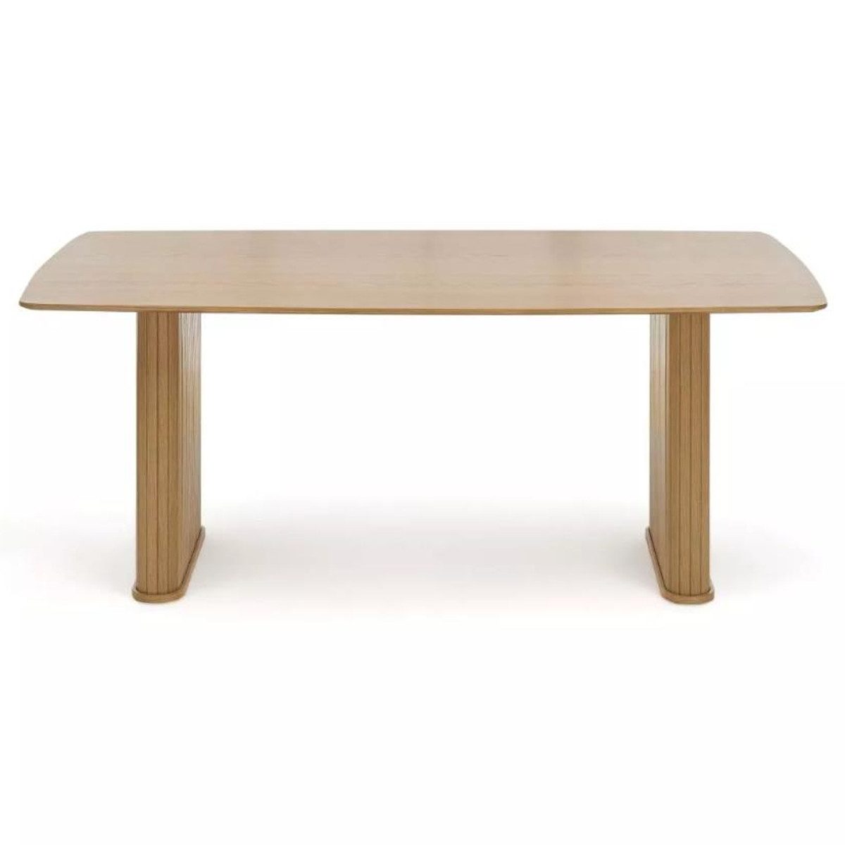 Der Esstisch Uriel von Liadomo bringt neuen Schwung in Ihr Esszimmer und kombiniert modernes Design mit einem Hauch Retro. Das besondere Wangen-Gestell mit Lamellenoptik aus Echtholzfurnier in warmer Eiche-Natur sorgt dabei für eine charmante Optik und unterstreicht das natürliche Ambiente in Ihrem Zuhause.