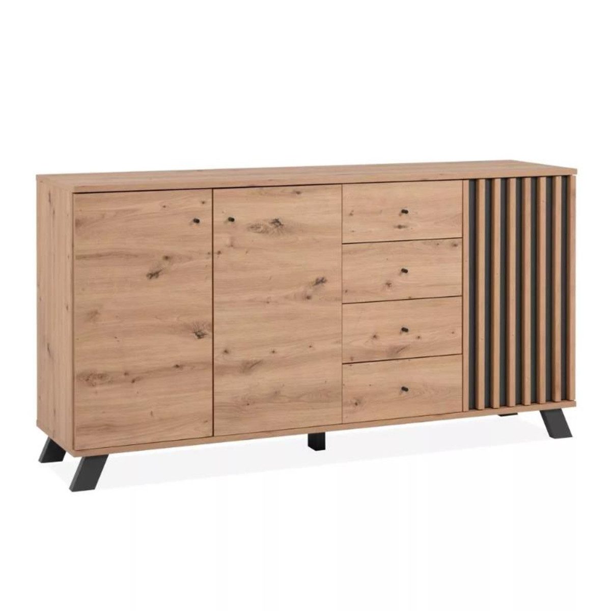 Die warme Ausstrahlung der Eiche Artisan Nachbildung schafft eine einladende Atmosphäre, während die anthrazitfarbenen Details moderne Akzente setzen. Besonders auffällig ist die rechte Tür, die durch ihre markante Lamellenoptik besticht. Dieses außergewöhnliche Designelement verleiht dem Sideboard eine strukturierte und dynamische Optik, die in jedem Raum ein Highlight setzt.
