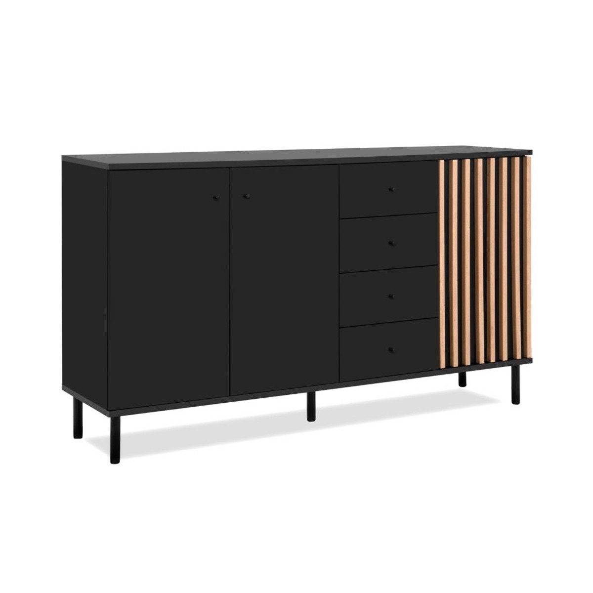 Mit drei Türen und vier Schubkästen bietet das Sideboard vielfältige Aufbewahrungsmöglichkeiten. Zwei Türen verbergen einen breiten Einlegeboden für größere Gegenstände wie Geschirr oder Bücher. Die vier Schubkästen eignen sich optimal für kleinere Dinge. Hinter der dritten Tür mit Lamellenoptik befindet sich ein weiterer Boden für zusätzlichen Stauraum.