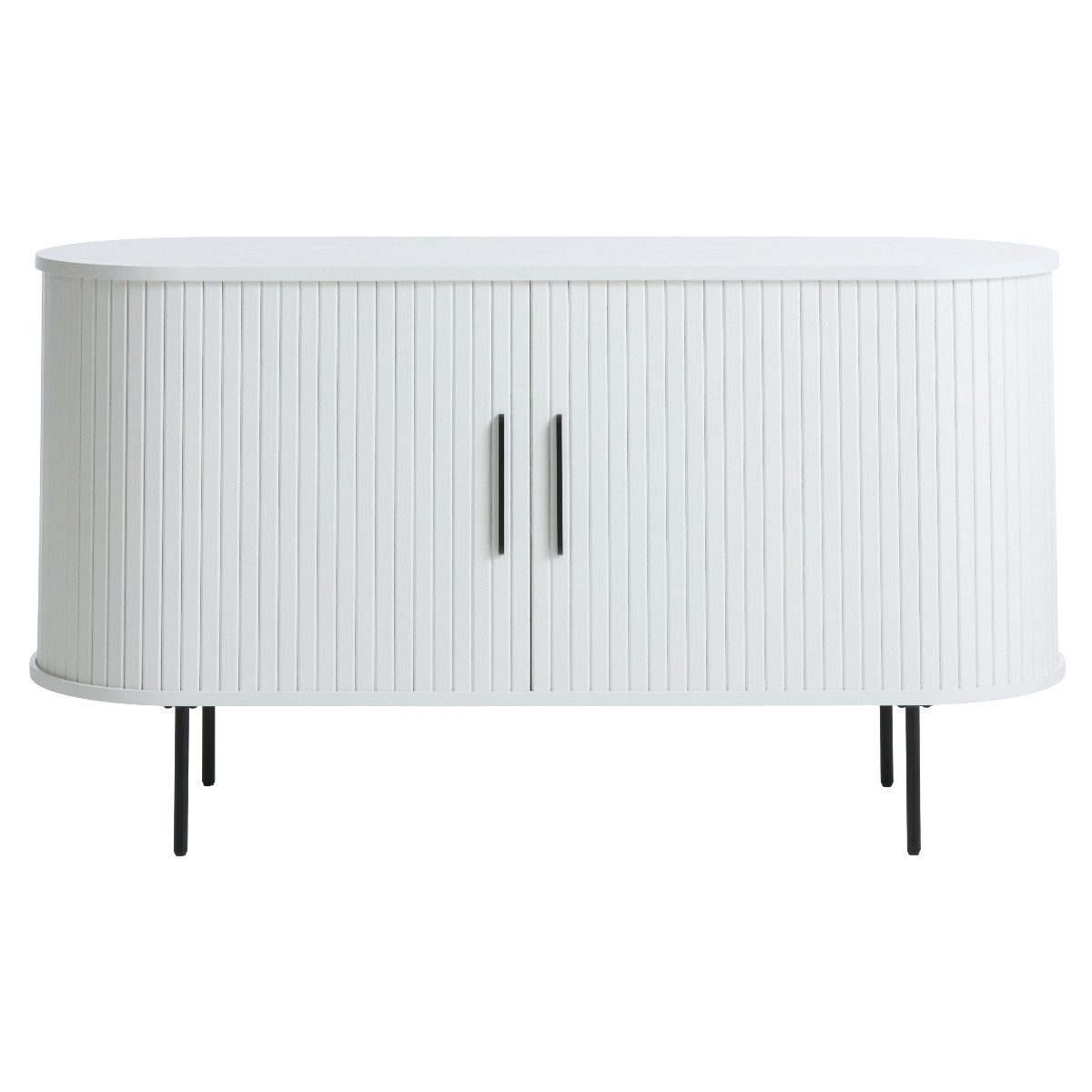 Die abgerundeten Seiten und die Metallfüße mit ca. 20 cm Höhe verleihen dem Sideboard eine elegante Leichtigkeit und erleichtern die Reinigung darunter. Schwarze Griffleisten setzen optische Akzente und harmonieren mit dem warmen Holzton der Lamellenfronten. Das Sideboard wirkt dadurch offen, klar strukturiert und gleichzeitig modern.