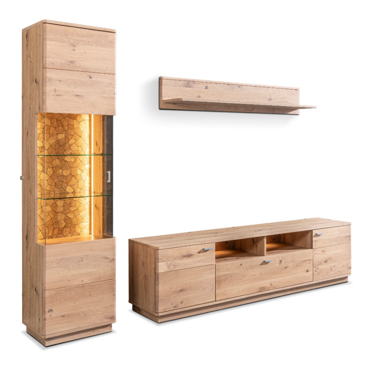 Die 3-teilige Wohnwand Cambia von Liadomo kombiniert hochwertige Materialien mit durchdachter Funktionalität. Mit einer Vitrine, einem Lowboard und einem Wandboard bietet sie großzügigen Stauraum und verleiht Ihrem Wohnzimmer einen natürlichen, einladenden Charakter.
