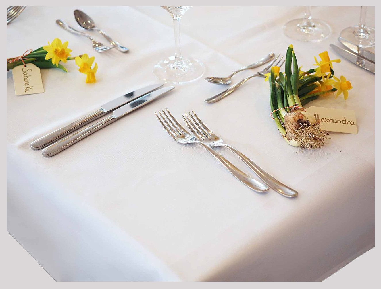 Die Tischdecke ist umlaufend fein gesäumt und sollte mit Feinwaschmittel bei 40°C in der Maschine gewaschen werden.