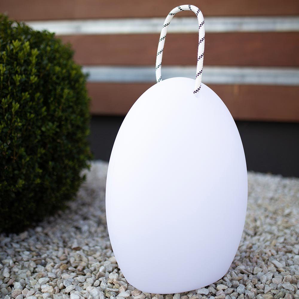 Diese moderne Leuchte in Mandelform hat die Maße Ø30,8cm x 39,5cm Höhe und ist mit der BULB SmartMESH® Leuchteinheit ausgestattet.Ein besonderes Accessoire ist das dekorative, hochwertige Seil im oberen Bereich der Leuchte. So ist es noch einfache die LED Leuchte an jeden gewünschten Platz mitzunehmen.AMANDE 395 ist bruchfest, witterungsbeständig, wasserfest und hat einen hochwertigen Lithium-Ionen Akku für die Energieversorgung. Zur Ladung des Akkus, wird die komplette Leuchte ganz einfach mit der Ladestation verbunden.