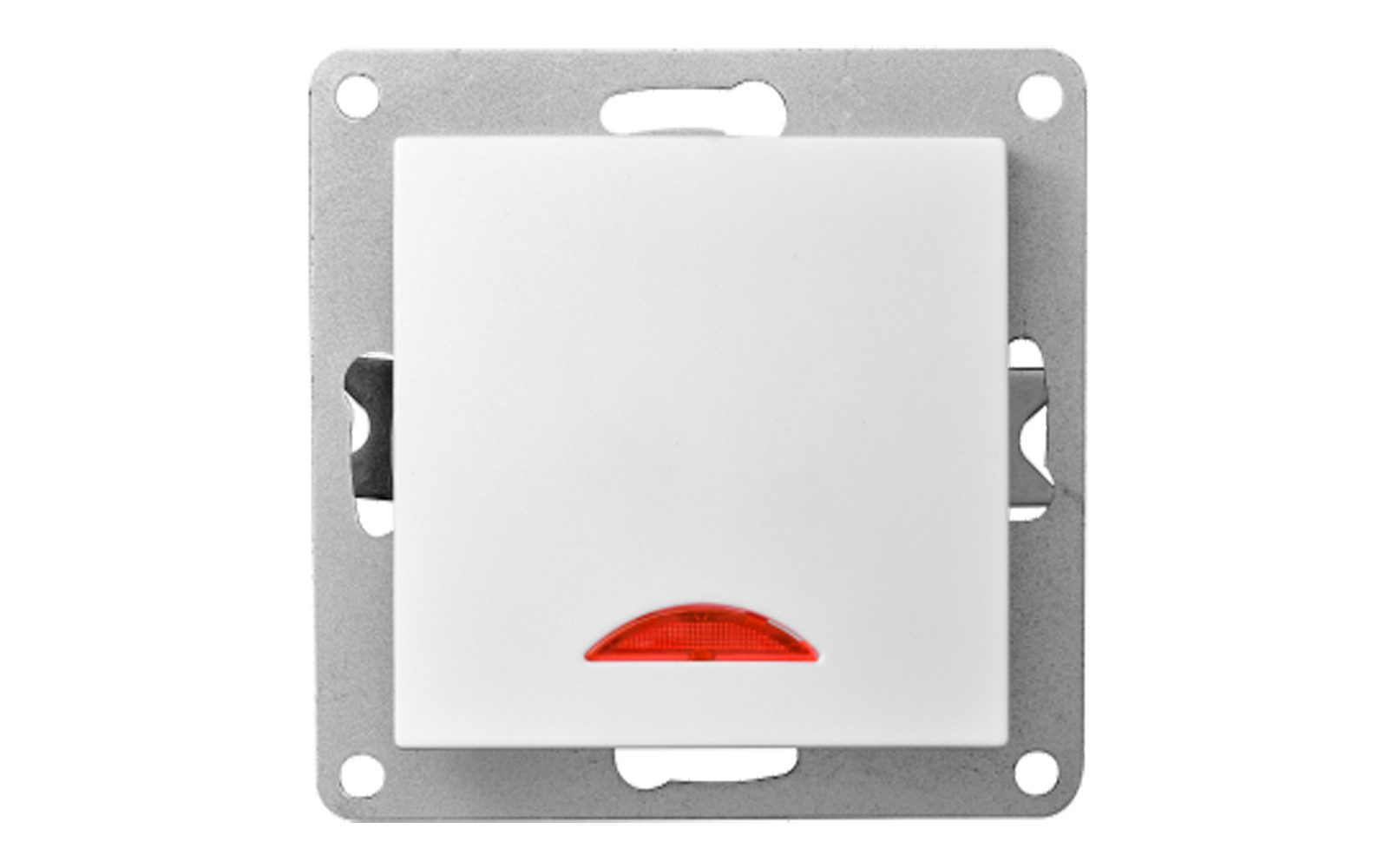 Schalter mit Kontroll Lampe aus der Serie Levina in weiß für moderne Raumgestaltung. Funktionelle und praktische Technik vereint für Glas oder Kunststoff Rahmen. Все LEVINA-Komponenten sind für Längs- und Quer Montage geeignet und mit einer eleganten Oberfläche versehen.