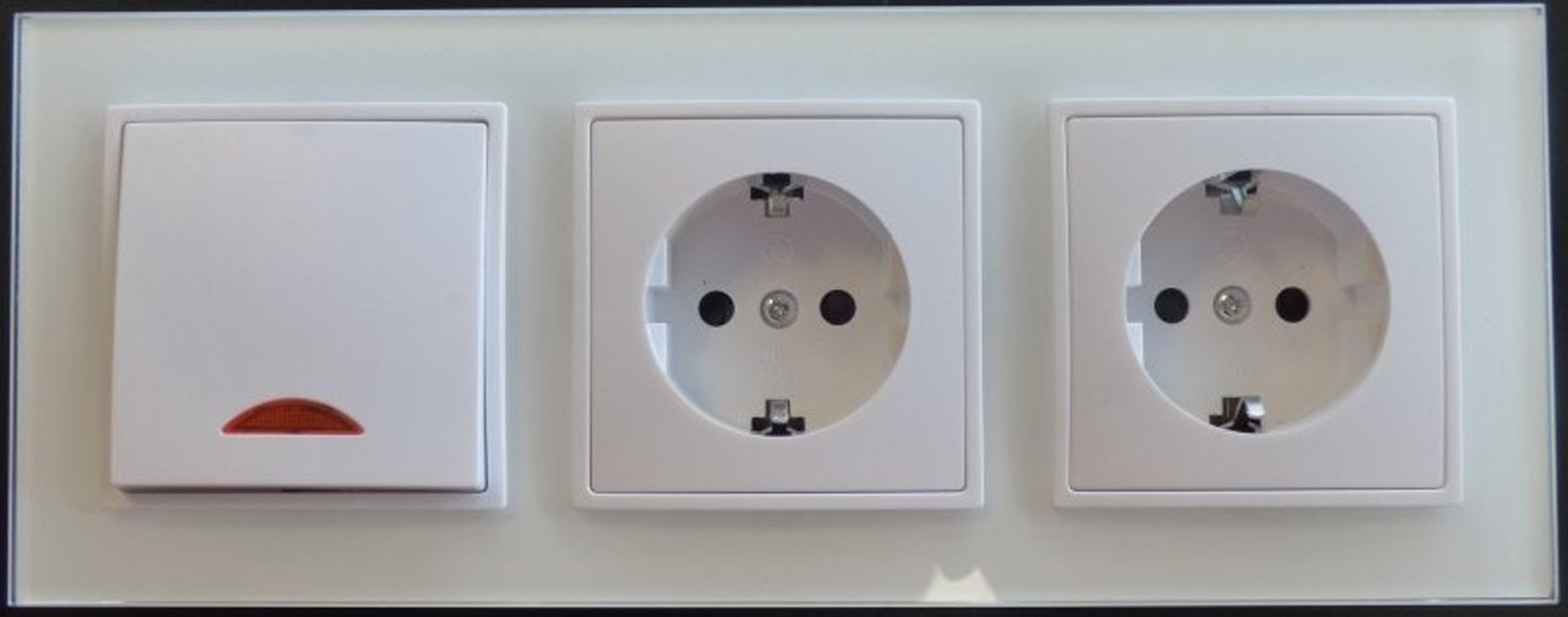 Kontroll Schalter mit Glimmlampe und zwei Schukosteck Dosen aus der Serie Levina in GLAS Ausführung weiß im 3-fach Rahmen.