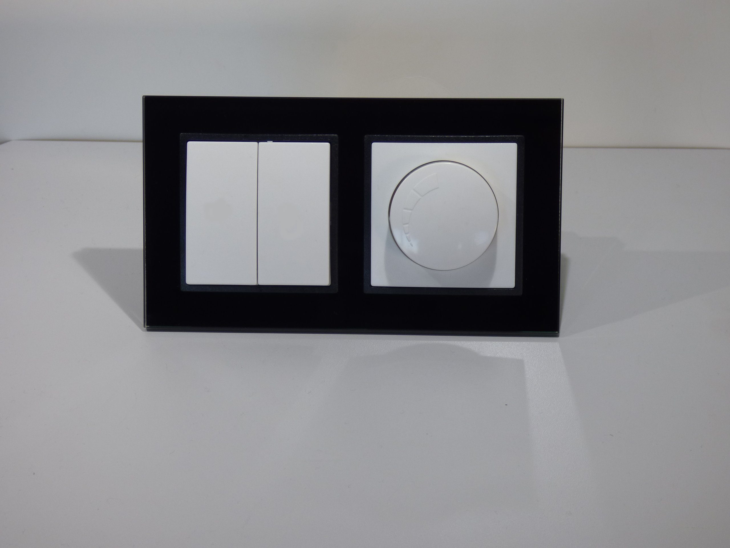 Serien Schalter mit Dimmer für Ohmsche Last im 2-er GLAS Rahmen in schwarz für moderne Raumgestaltung.