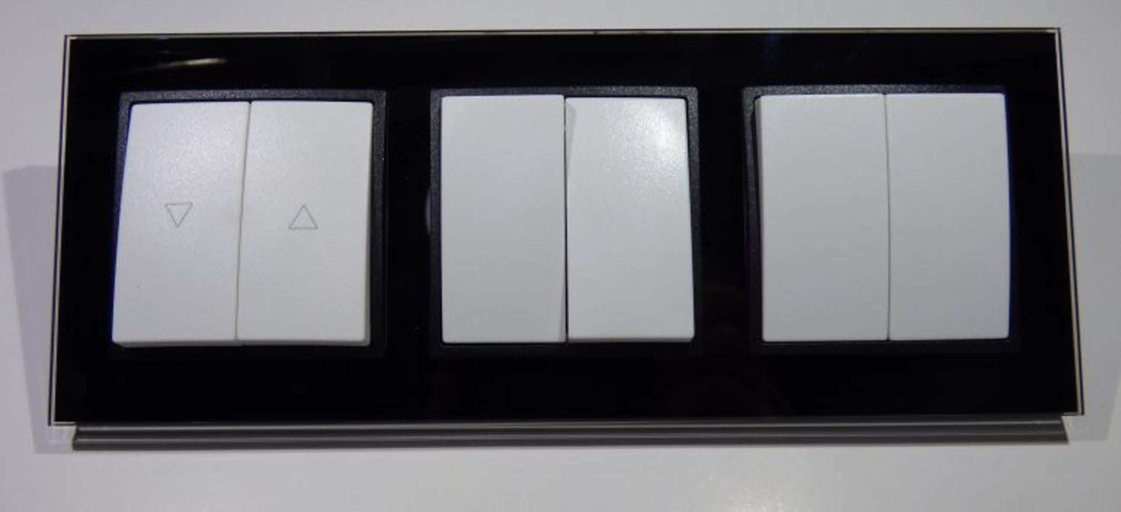 2x Wechsel Schalter mit 1x Jalousie Taster in schwarzem 3-fach schwarzem GLAS Rahmen.
