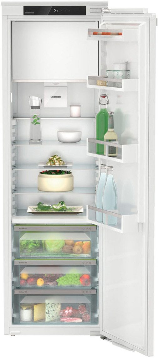 Der Einbaukühlschrank »IRBd 5121_994880251« von Liebherr hat eine hohe Funktionalität und ist integrierbar. Das Gerät bietet ausreichend Platz für deinen Einkauf durch seine Maße von 55,9 x 177 x 54,6 cm (B/H/T) und das Gefriervolumen von 27 l und Kühlvolumen von 248 l. Das Modell arbeitet mit einem Betriebsgeräusch von 34 dB. Das Modell besitzt drei Gemüseschubladen. Das innen installierte TouchControl-Display zeigt die genaue Temperatur im Gerät an und ermöglicht eine komfortable Bedienung. Auf fünf Ablageflächen aus Glas, davon vier höhenverstellbar, ist im Einbaukühlschrank viel Platz für Lebensmittel. Zusätzliche Variabilität bei der Lagerung bieten die vier Türablagen. Wenn die Tür zu lange offen steht, macht der Einbaukühlschrank über ein optisches und akustisches Warnsignal darauf aufmerksam. Den Überblick behält man außerdem durch die LED-Innenbeleuchtung. Wer auf der Suche ist nach einem Modell, das genug Platz für Lebensmittel bietet, der trifft mit dem »IRBd 5121_994880251« von Liebherr eine gute Wahl.
