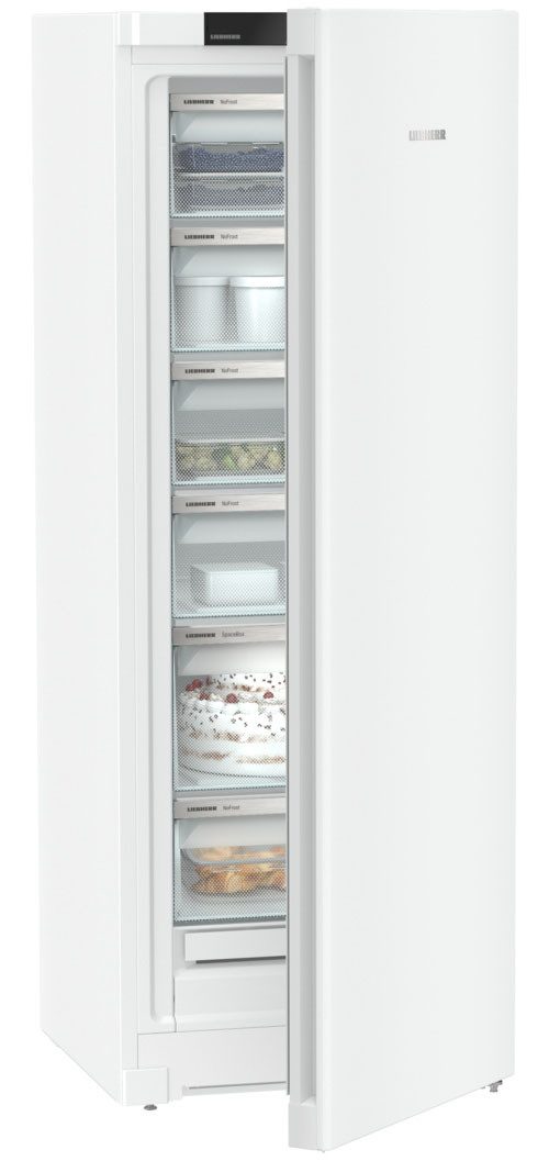 Der »FNd 5026« ist ein freistehender Gefrierschrank von Liebherr und überzeugt mit hoher Funktionalität. Die Abmessungen des Gefrierschranks kommen auf 59,7 x 165,5 x 67,5 cm (B/H/T). Das Modell arbeitet mit einem Betriebsgeräusch von 38 dB. Regelmäßiges Abtauen ist mit der No Frost-Funktion passé – ein Umluftsystem leitet die Luftfeuchtigkeit aus dem Gefrierraum ab, wodurch das Gerät nie wieder abgetaut werden muss. Es sind sechs Gefrierschubladen zum Verstauen des Einkaufs integriert. Auf dem innen installierten Display kann die genaue Temperatur im Gerät abgelesen werden. Die Supergefrier-Funktion sorgt dafür, dass sich die Lebensmittel besonders schnell kühlen und einfrieren lassen. Bei offen stehender Tür meldet dies der Gefrierschrank mit einem optischen und akustischen Warnsignal. Die Tür des Modells kann links- und rechtsseitig montiert werden. Wer auf der Suche ist nach einem Modell, das genug Raum für Nahrungsmittel bietet, der trifft mit dem »FNd 5026« von Liebherr eine gute Wahl.