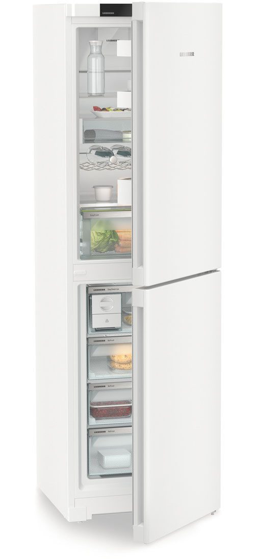 Die Kühl- und Gefrierkombination »CNc 5724_994899251« von Liebherr hat eine hohe Funktionalität sowie die Energieeffizienz-Klassifizierung C (Skala Energieeffizienz-Klassifizierung A bis G) und ist freistehend. Ausreichend Platz bietet das 59,7 x 201,5 x 67,5 cm (B/H/T) große Gerät mit seinen 132 l Gefriervolumen und 227 l Kühlvolumen. Das Modell arbeitet mit einem Betriebsgeräusch von 35 dB. Durch die No Frost-Funktion muss das Gerät nie wieder abgetaut werden. Das Gerät besitzt vier Gefrierschubladen und eine Gemüseschublade. Eine kinderleichte Bedienung ermöglicht das außen liegende Touch-Display. Die vier Ablageflächen, darunter drei höhenverstellbar, bieten viel Platz für Lebensmittel. Schnell griffbereit sind Lebensmittel in den drei Türablagen. Die Schnellgefrier-Funktion sorgt dafür, dass sich die Lebensmittel besonders schnell kühlen und einfrieren lassen. Das DuoCooling-System sorgt außerdem dafür, dass zwischen dem Kühl- und Gefrierteil keine Geruchsübertragung stattfindet und die Lebensmittel nicht austrocknen. Liegt eine Fehlfunktion vor oder steht die Tür zu lange offen, gibt die Kühl- und Gefrierkombination ein optisches und akustisches Warnsignal. Perfekte Übersichtlichkeit erhält man außerdem durch die LED-Innenbeleuchtung. Für diejenigen, die auf der Suche nach einer Kühl- und Gefrierkombination sind, ist die »CNc 5724_994899251« von Liebherr eine gute Wahl.