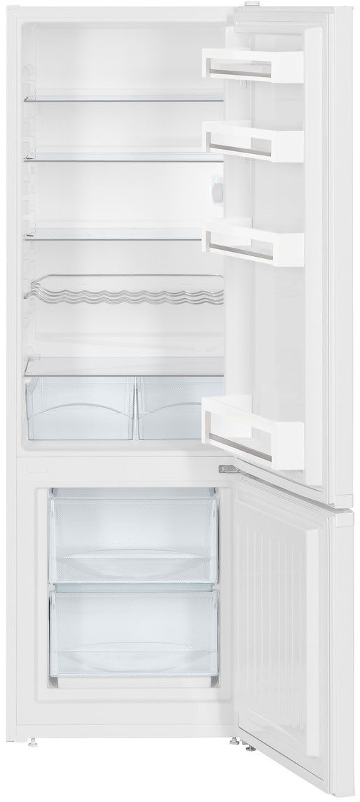 Die freistehende Kühl- und Gefrierkombination »CUe 2831_997205951« ist von der Marke Liebherr. Das Modell bietet ausreichend Platz für deinen Einkauf durch seine Maße von 55 x 161,2 x 63 cm (B/H/T) und das Gefriervolumen von 54 l und Kühlvolumen von 212 l. Das Modell arbeitet mit einem Betriebsgeräusch von 39 dB. Durch die SmartFrost-Technologie wird die Bereifung des Innenraums und des Gefrierguts stark reduziert und das Abtauen damit seltener notwendig. Es sind zwei Gefrierschubladen und zwei Gemüseschubladen zum Verstauen des Einkaufs integriert. Die Kühl- und Gefrierkombination hat vier Ablageflächen aus Glas, darunter drei höhenverstellbar, die viel Platz für Lebensmittel bieten. Die vier Türablagen ermöglichen eine übersichtliche Aufbewahrung. Auch das Flaschenregal der Kühl- und Gefrierkombination ist sehr praktisch. Die Schnellgefrier-Funktion sorgt dafür, dass sich die Lebensmittel besonders schnell kühlen und einfrieren lassen. Всеs im Blick hat man außerdem durch die LED-Innenbeleuchtung. Die »CUe 2831_997205951« von Liebherr ist eine Kühl- und Gefrierkombination, die mit ihren Features überzeugt und genug Platz für Lebensmittel aller Art bietet.