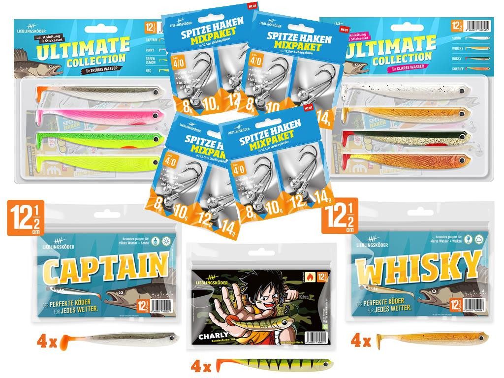1 x Lieblingsköder 12,5 cm - klares Wasser - Packungsinhalt 4 Stk. 1 x Lieblingsköder 12,5 cm - trübes Wasser - Packungsinhalt 4 Stk. 1 x Lieblingsköder 12,5 cm - Captain - Packungsinhalt 4 Stk. 1 x Lieblingsköder 12,5 cm - Whisky - Packungsinhalt 4 Stk. 1 x Lieblingsköder 12,5 cm - Charly - Packungsinhalt 4 Stk. 4 x # 4/0 - Jigköpfe - Mixpaket - Packungsinhalt 4 Stk - von 8 g bis 14 g