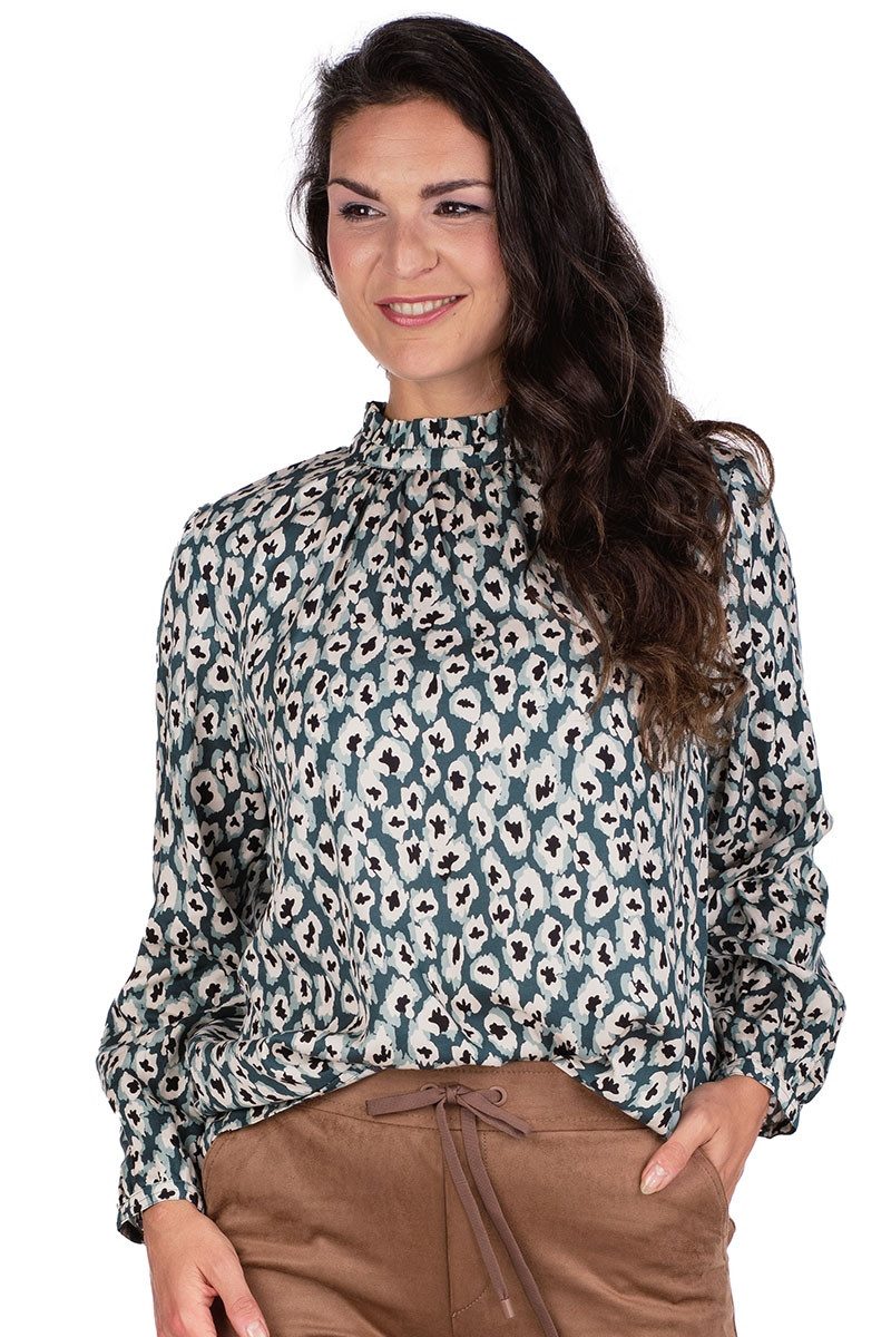 Diese fesche, lässig geschnittene Bluse "Ediliana" zum Reinschlüpfen aus angenehm weich fließendem Tencel hat einen kecken Rüschenkragen, lange Ärmel mit geknöpften Bündchen und allover ein entzückendes, floral anmutendes Printmuster. Tencel ist ein biologisch abbaubares Material aus industriell hergestellten Cellulosefasern aus Holz, welches aus nachhaltiger Forstwirtschaft stammt. Der Alloverprint aus angedeuteten Blüten in Creme mit schwarzen Blütenstempeln und salbeifarbenen Akzenten auf einem flaschengrünen Untergrund macht das bezaubernde Blusenshirt zum Eyecatccher. Der verstärkte Rundhals-Ausschnitt ist oben mit niedlichen Rüschen geschmückt, die einen kleinen Kragen ergeben. Vorn unter dem Kragen ist die Damenbluse leicht gerafft und hinten gibt es eine kurze Knopfleiste mit kleinen, edel schimmernden Knöpfen aus echtem Perlmutt. Die locker geschnittene, bequeme Ärmel sind an den Enden leicht gerafft, haben umsäumte Ärmelschlitze und schmale Bündchen mit Perlmuttknopf. Unten links neben der Seitennaht ist ein niedlicher Herz-Anhänger mit Schriftzug und Herzmotiv angebracht.