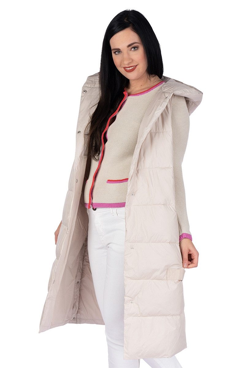 Diese stylische, lange Damen Steppweste namens Isy im angesagten Oversize-Schnitt mit großer Kapuze von der Marke Lieblingsstück hat ein sehr breites Querstreifen-Steppmuster und eine spezielle, atmungsaktive, superleichte, teilweise pflanzliche Sorona-Wattierung. Vorn gibt es eine Verschlussleiste mit farblich passenden Druckknöpfen und auch die Seitennähte sind unten für eine super Beinfreiheit mit Druckknöpfen versehen. Jeweils unter dem oberen Knopf an den Seiten ist ein waagerechtes, breites Ripsband Ton-in-Ton mit Marken-Print als Verstärkung angebracht. Zudem verfügt die modische Damenweste über zwei Eingrifftaschen mit Fleecefutter und über eine Innentasche rechts. Den Rücken ziert innenseitig längs eine breite Stoffborte in Marken-typischen Farben. Die trendy Steppweste in toller Длина lässt sich herrlich kombinieren und ist angenehm wärmend.