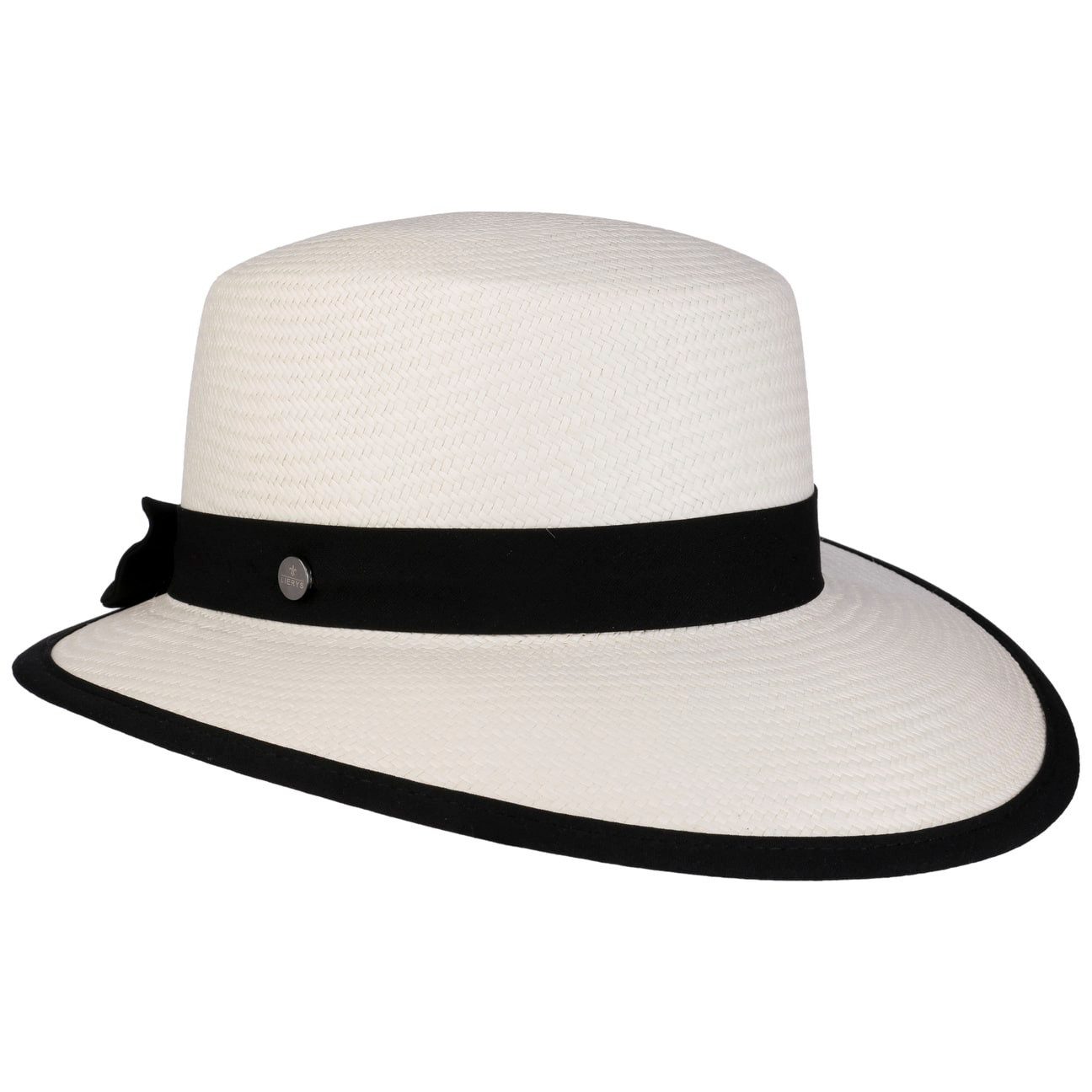 Zeitlose Eleganz. Dieser Sommerhut aus Panamastroh hat eine nostalgische Form mit verkürzter Krempe hinten und einem längeren Schirm vorne. Die weichen Palmfasern garantieren einen optimalen Tragekomfort. Ein femininer Strohhut in hervorragender Verarbeitung, der mit einem hochwertigen Futterband ausgestattet ist, gekrönt von einem eleganten Hutband und mit einem edlem Stoffeinfass gesäumt ist. Ein stilvoller und feiner Damenhut für elegante Sommertage. Handgefertigte Premium-Qualität aus Ecuador.