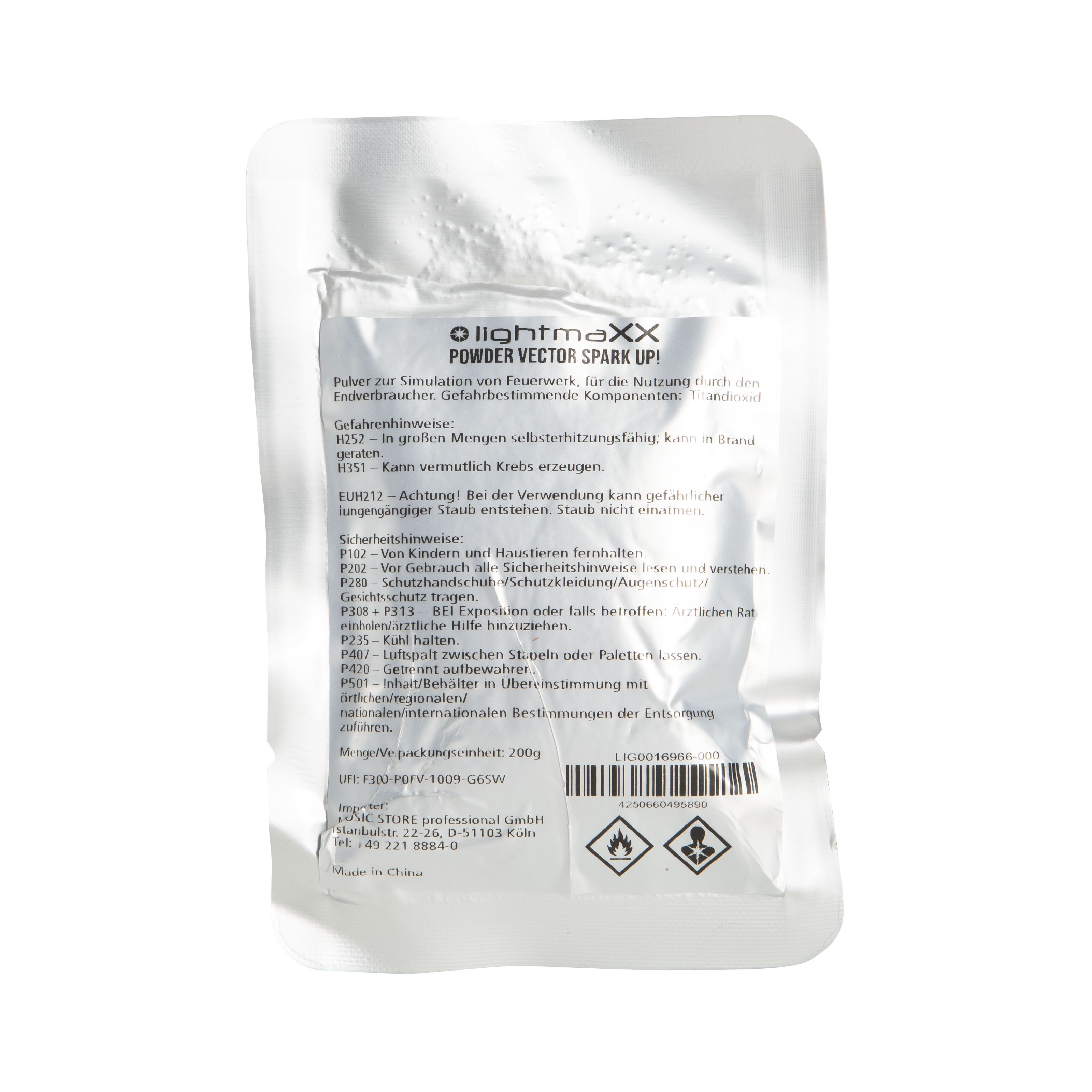 Lieferumfang | LightmaXX Powder VECTOR Spark Up! 200g - Spezielles Granulat für Funken-Effekte. Hochwertiges lightmaXX Powder VECTOR Spark Up! 200g - Perfekt für Effektmaschinen. Erleben Sie beeindruckende Funken-Effekte mit lightmaXX Powder VECTOR Spark Up! 200g. Sicher und effektiv: LightmaXX Powder VECTOR Spark Up! 200g für professionelle Effektmaschinen. Verwandeln Sie Ihre Veranstaltung mit lightmaXX Powder VECTOR Spark Up! 200g in ein spektakuläres Erlebnis.