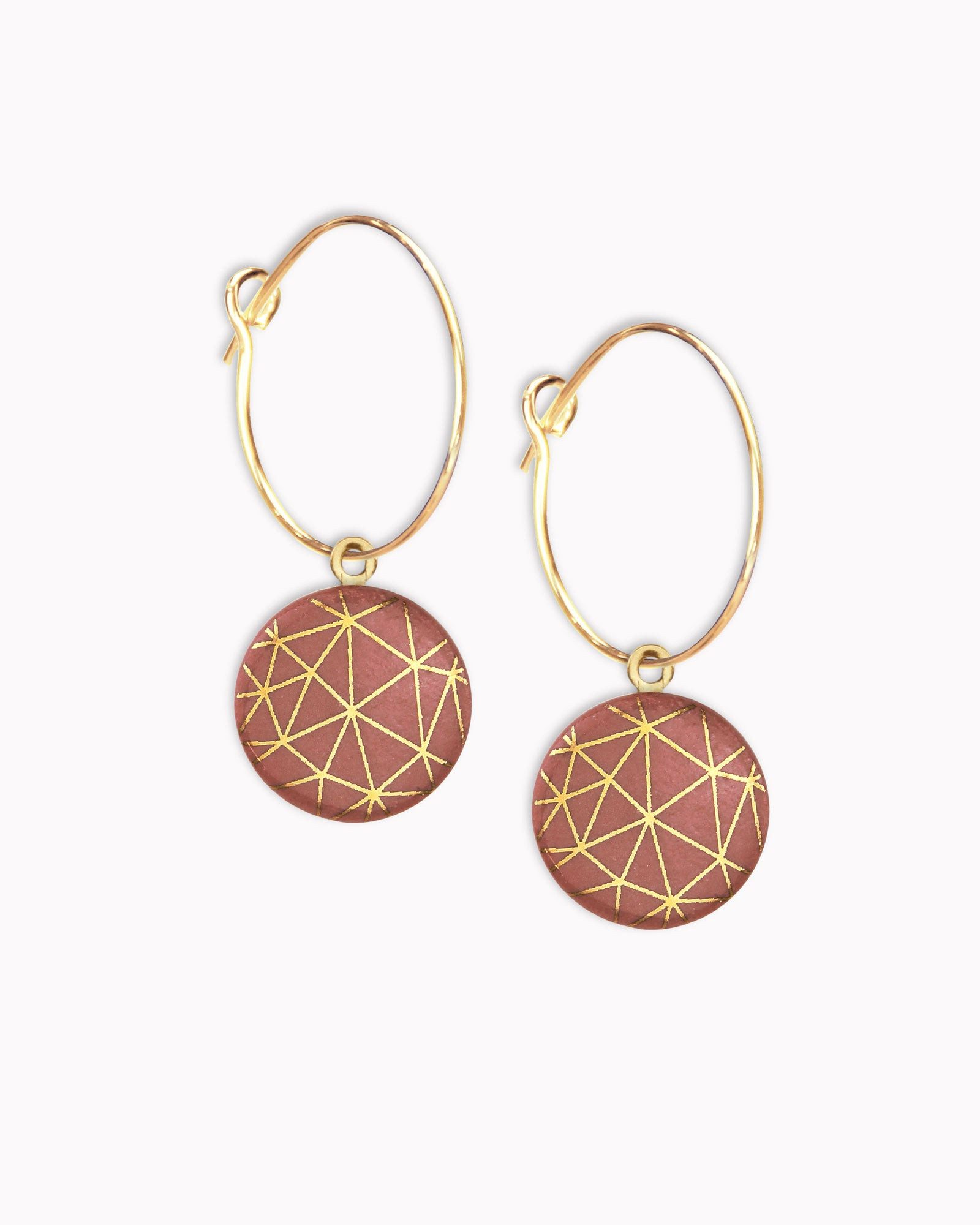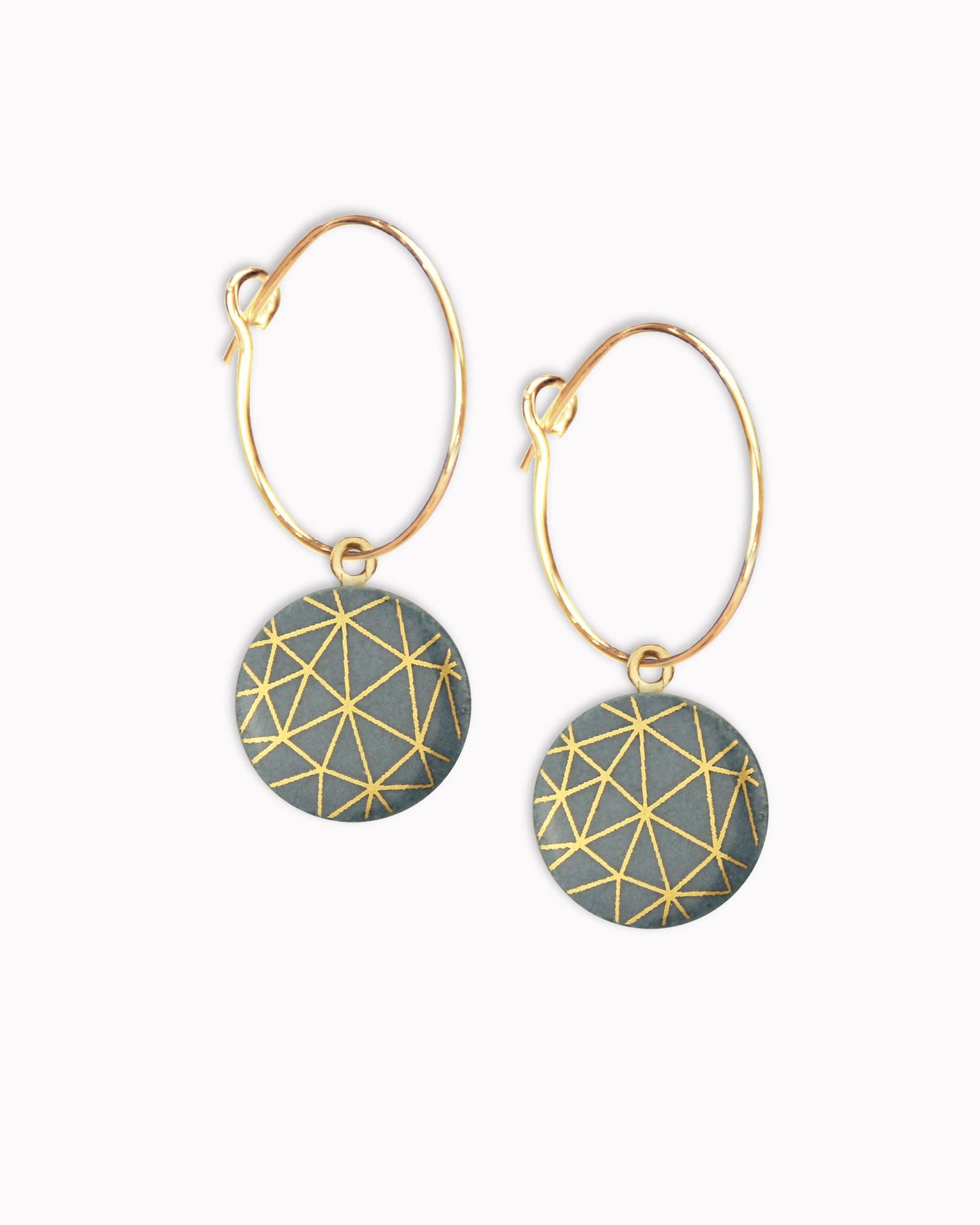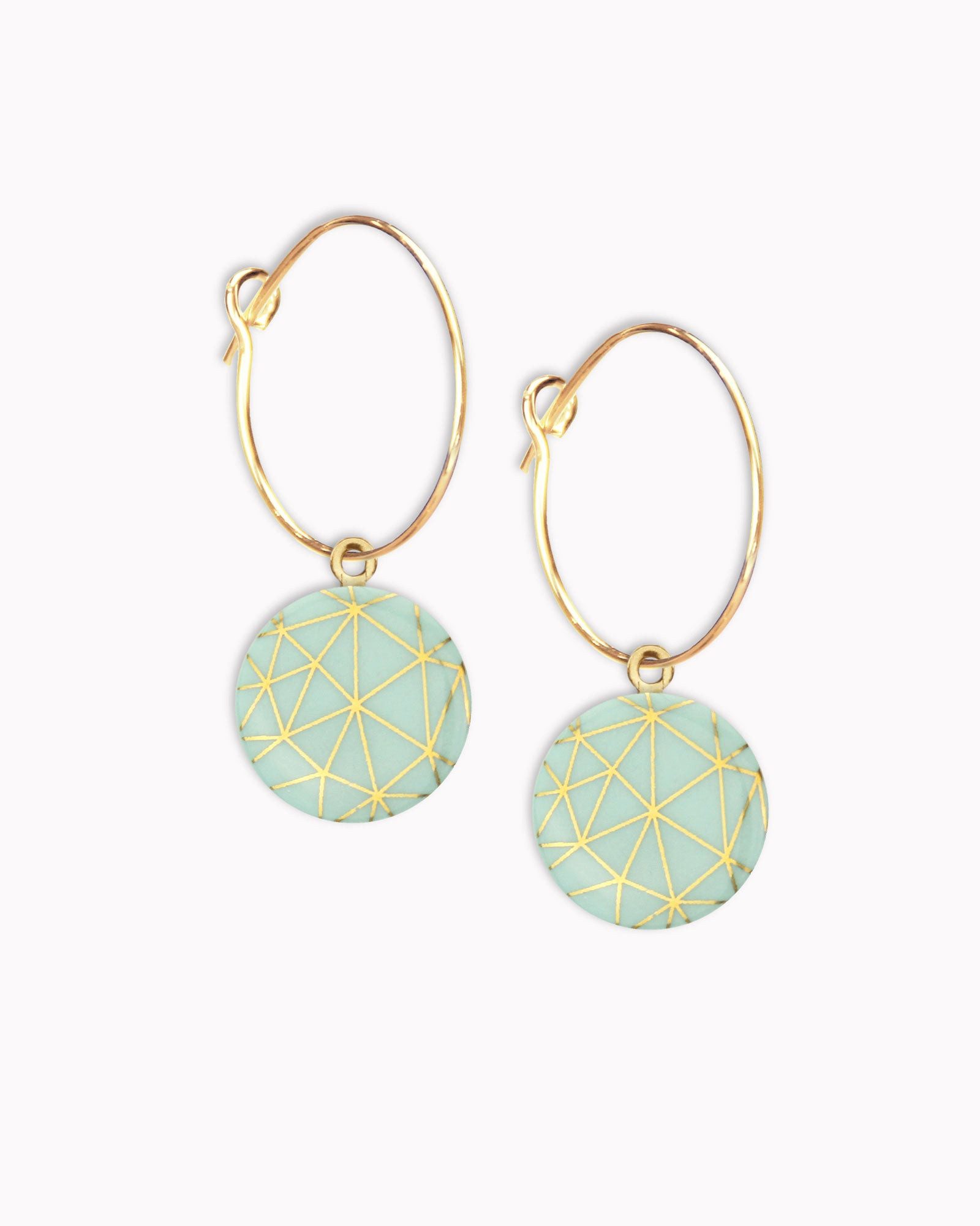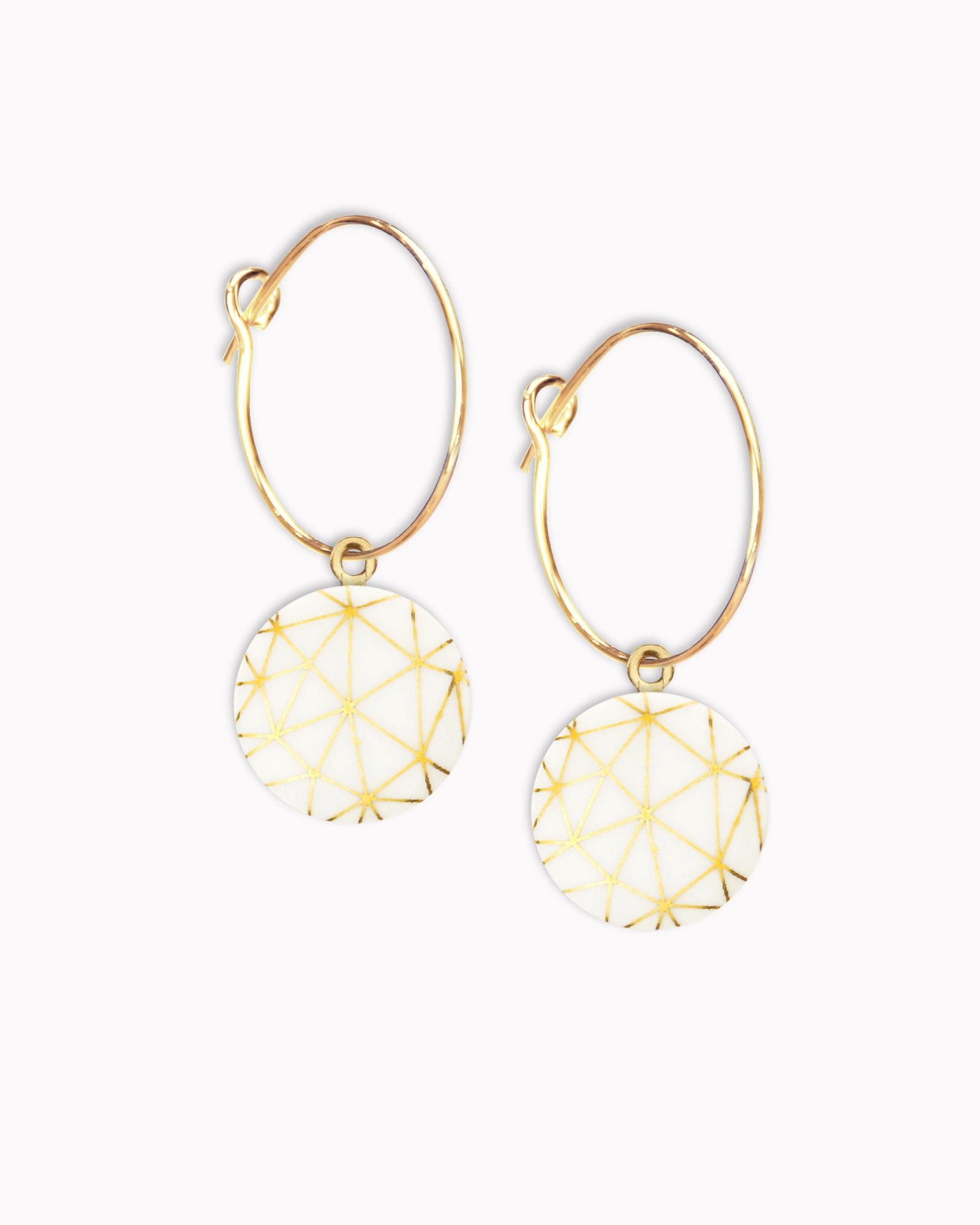 Die filigranen Creolen verzaubern durch ihre hochwertige Verarbeitung und ihr zeitloses Design. Durch den Porzellan-Anhänger mit Geo-Dekor aus 24 Karat Gold werden sie zu etwas ganz Besonderem. Die Porzellanplättchen werden in Deutschland von Hand aus Porzellan gefertigt, wodurch jedes Stück zum Unikat wird. Jedes Schmuckstück wird dabei dreimal gebrannt. Das Feingold wird im letzten Schritt bei 800 Grad in das Porzellan eingebrannt. Durch dieses aufwendige Brennverfahren wird der Schmuck kratz- und stoßfest. Porzellan ist ein langlebiges und zeitloses Material, an dem du lange Freude haben wirst. Da die Fläche des Porzellanplättchens wesentlich kleiner ist als z.B. bei einem großen Teller, ist es auch sehr robust. Die Creolen sind aus vergoldetem 925 Silber.