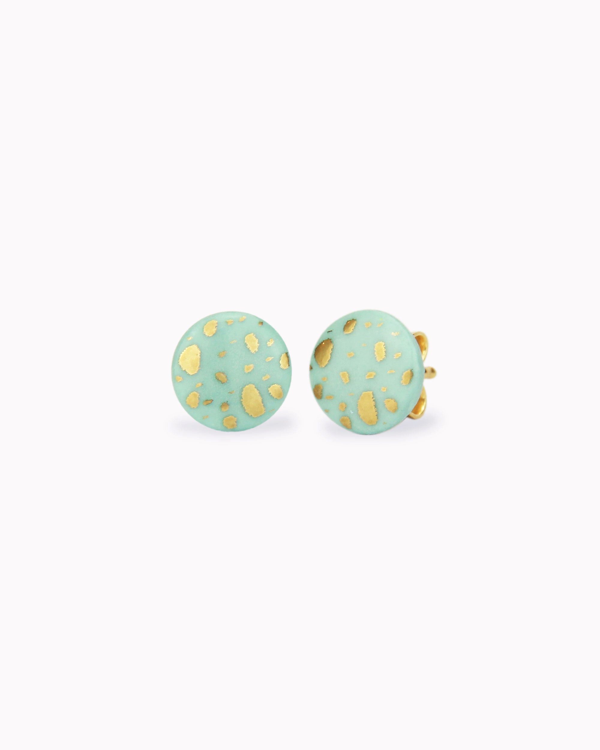 Die wunderschönen Ohrstecker verzaubern durch ihre hochwertige Verarbeitung und ihr elegantes Design. Trotz der schlichten Form werden die Stecker durch das Terrazzo-Dekor aus 24 Karat Gold zu einem schmückenden Schatz an deinen Ohren. Die Ohrstecker werden in Deutschland von Hand aus Porzellan gefertigt, wobei jedes Schmuckstück dreimal gebrannt wird. Das Feingold wird im letzten Schritt bei 800 Grad in das Porzellan eingebrannt. Durch dieses aufwendige Brennverfahren wird der Schmuck kratz- und stoßfest. Die Stecker sind aus vergoldetem 925 Silber.