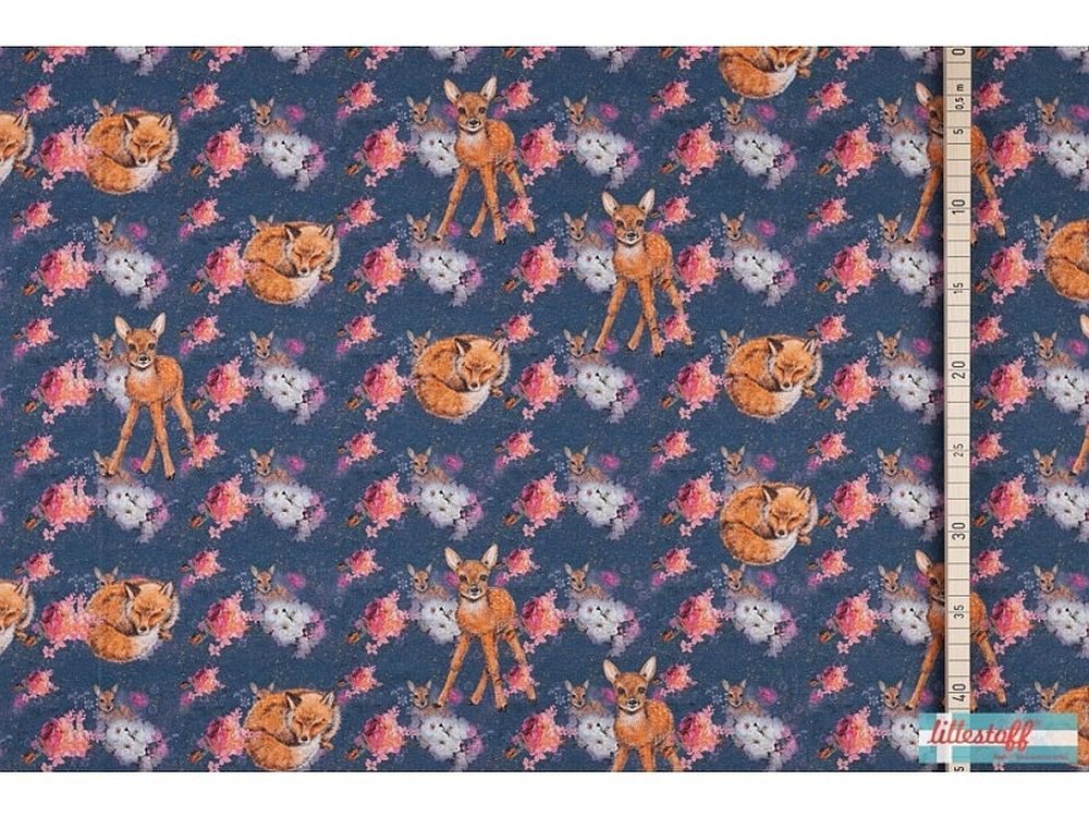 Realistisch gezeichnete Füchse und Rehe reihen sich zwischen Rosen auf einem jeansblauen Hintergrund. Das Design von Tante Gisi wurde mit zertifizierten Farben auf hochwertigem Bio-Jersey von Lillestoff gedruckt. Baumwolljersey wird überwiegend für Kleidung, zum Beispiel für Kinderkleidung und Bettwäsche verwendet. Er ist elastisch, weich und angenehm auf der Haut, da er aus Baumwolle und Elasthan besteht. Material: 95% Bio-Baumwolle kbA 5% Elasthan Breite: 150 cm Gewicht: 200 gr/qm Bioqualität: Mit Biofarben gedruckt. Muster: Tiere, Federn, Animalprint Anlass: Merkmale: Zielgruppe: Frauen, Kinder Verwendung: Shirts, Kleider, Leggings - elastisch Designer: Tante Gisi Herkunft: Deutschland Waschempfehlung: 30 Grad +++ Hinweise zur Bestellmenge +++ 1 Stück im Warenkorb ist 50 cm lang. Panels können davon abweichen. Bestellst du mehrere Einheiten von einem Stoff, liefern wir den Stoff natürlich in einem Stück. Falls das einmal nicht möglich ist, informieren wir dich vor dem Versand darüber.