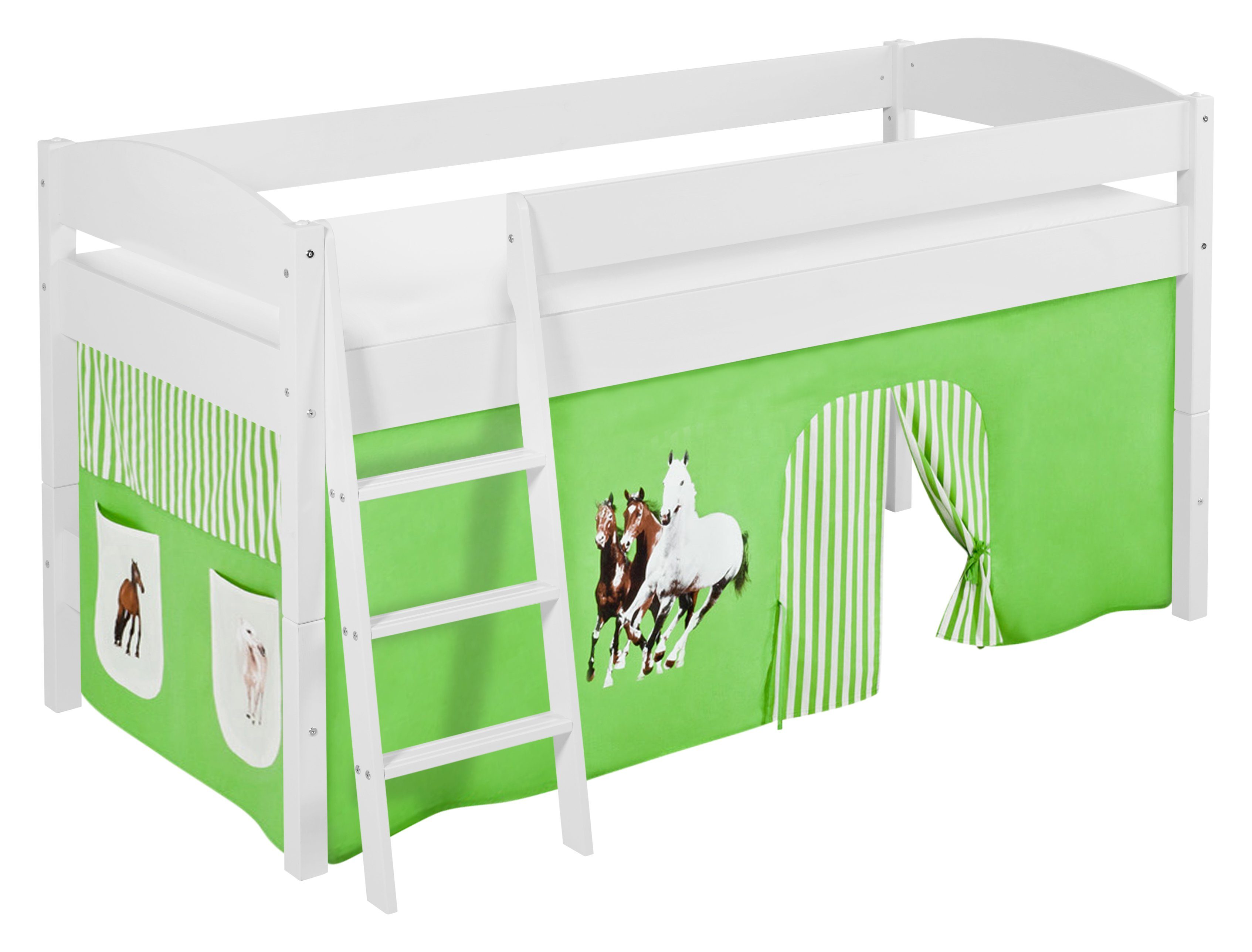 Mitwachsendes Systembett zum Spielen, Schlafen und Träumen. Dieses halbhohe, zeitlose Spielbett IDA der Marke LILOKIDS ist der Liebling aller Kinder und Eltern. Mit wenigen, einfachen Handgriffen kann das Bett aus Kiefer Massivholz in ein Einzelbett oder mit einem zusätzlich erhältlichen Umbausatz in ein Hochbett oder L-Etagenbett umgebaut werden. Dadurch ist das Bett auch später noch als Jugendbett verwendbar. Durch die Vorhänge lädt unser Systembett IDA nicht nur zum Träumen, sondern auch zum Spielen ein und weckt die Fantasie Ihres Kindes. Damit das Spielbett in jedem Kinderzimmer Platz findet, lässt sich die Leiter beidseitig montieren. Der Vorhang ist inklusive. Bitte beachten Sie, dass unsere weiteren Accessoires wie Tunnel, Taschen, Hängeregal, Lattenrost, Matratze und Dekoration nicht im Lieferumfang enthalten sind. Dieses Zubehör können Sie separat hier im Shop hinzubestellen. Bei Kindermöbeln sollten Sie besonders auf die Sicherheit Ihres Kindes achten. Die Absturzsicherung sowie die Pfostenstärke von 5,4 x 5,4 cm machen IDA zu einer kindersicheren Sache. Wir gewähren für alle LILOKIDS-Betten eine robuste Konstruktion und gute Verarbeitung gemäß den Normen EN 747:2015 für Kinderhoch- und Etagenbetten.