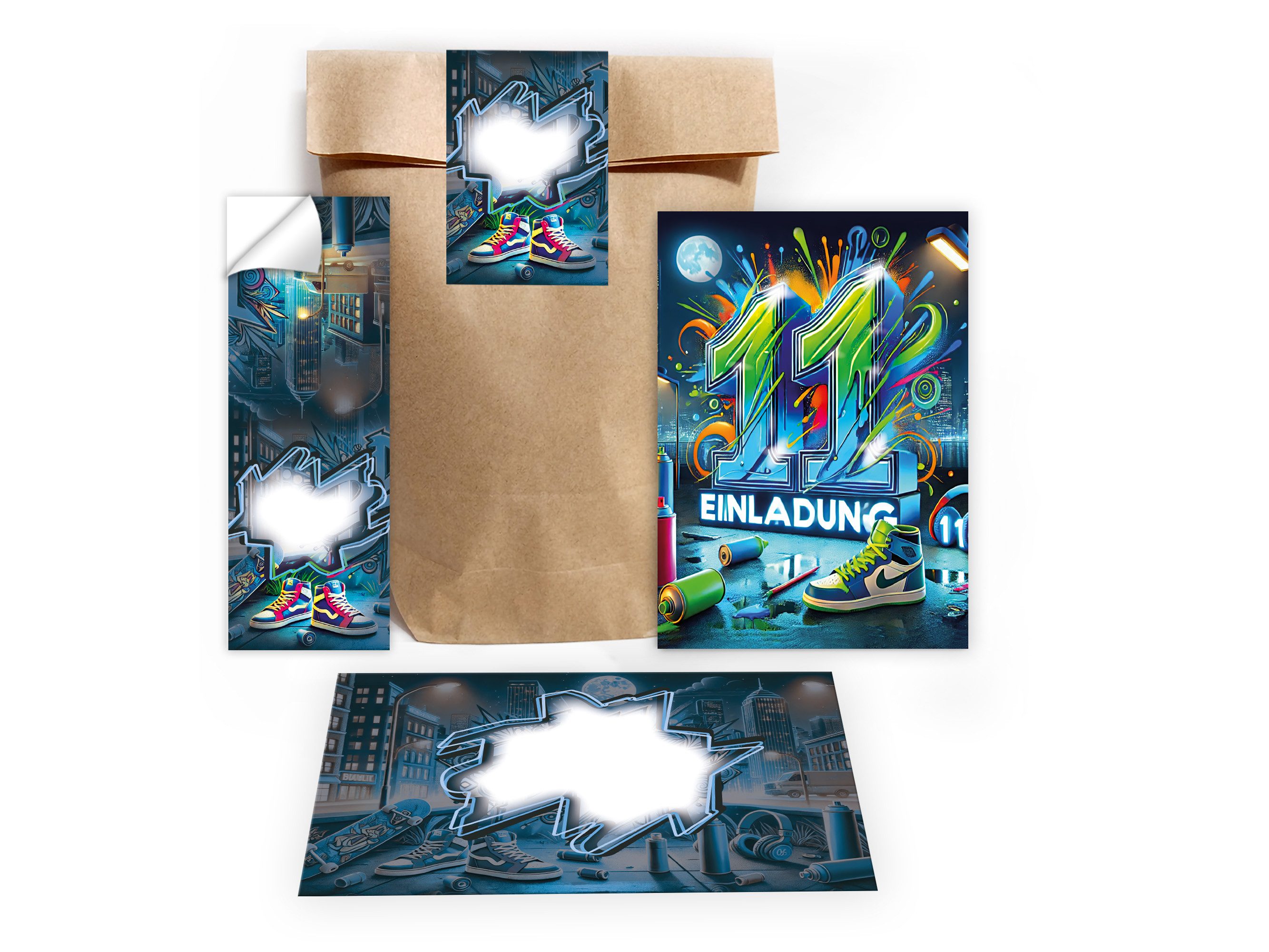 LIMONIA Einladungskarten Graffiti zum 11. Geburtstag Einladung Karten mit Umschlägen Mitgebsel, Mitgebsel Set mit Graffiti Motiv für Kinder zum elften Geburtstag