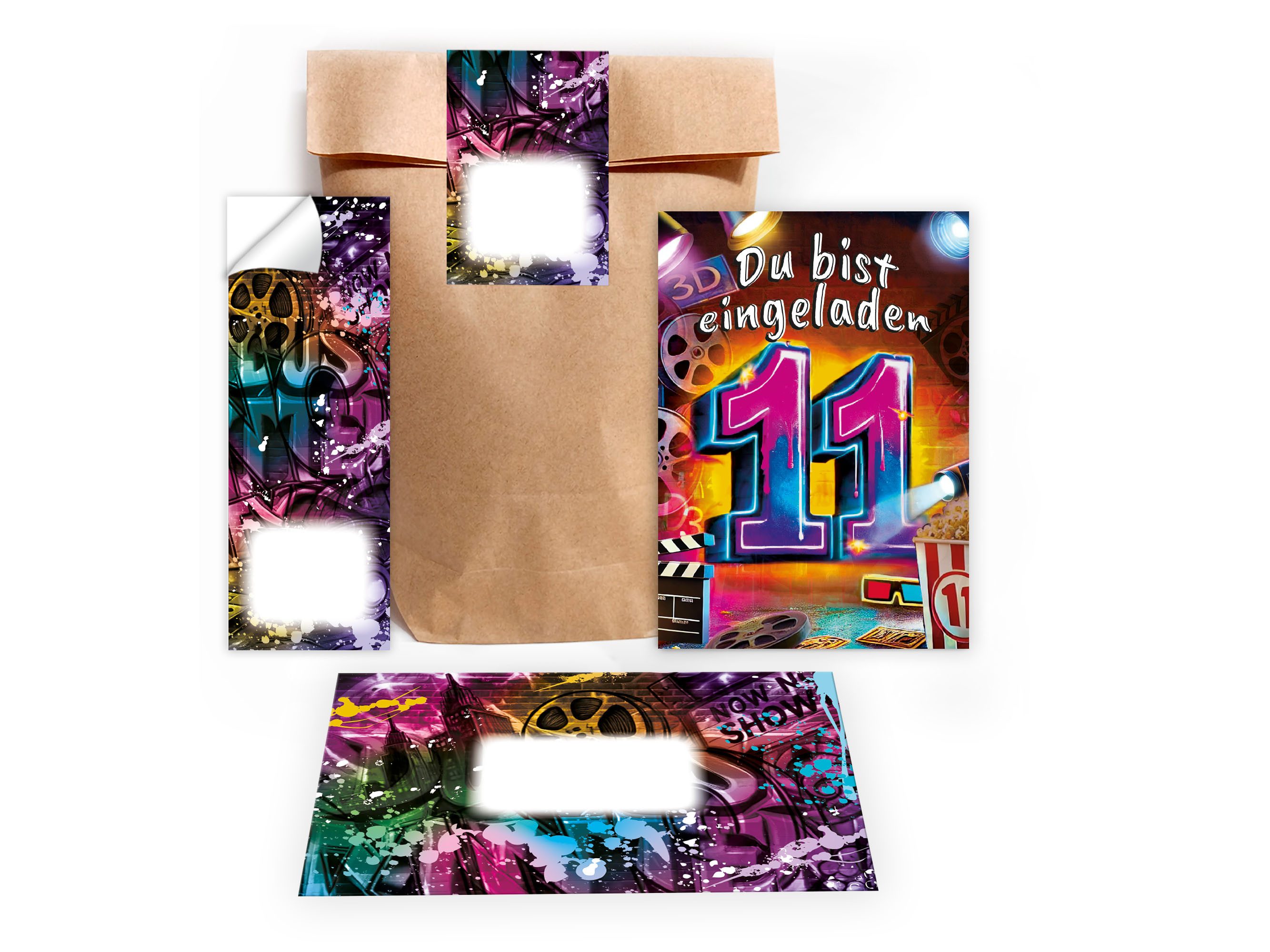 LIMONIA Einladungskarten Kino Party zum 11. Geburtstag Einladungen mit Umschlägen Mitgebsel, Mitbringsel Set zum elften Kindergeburtstag Gastgeschenke Graffiti