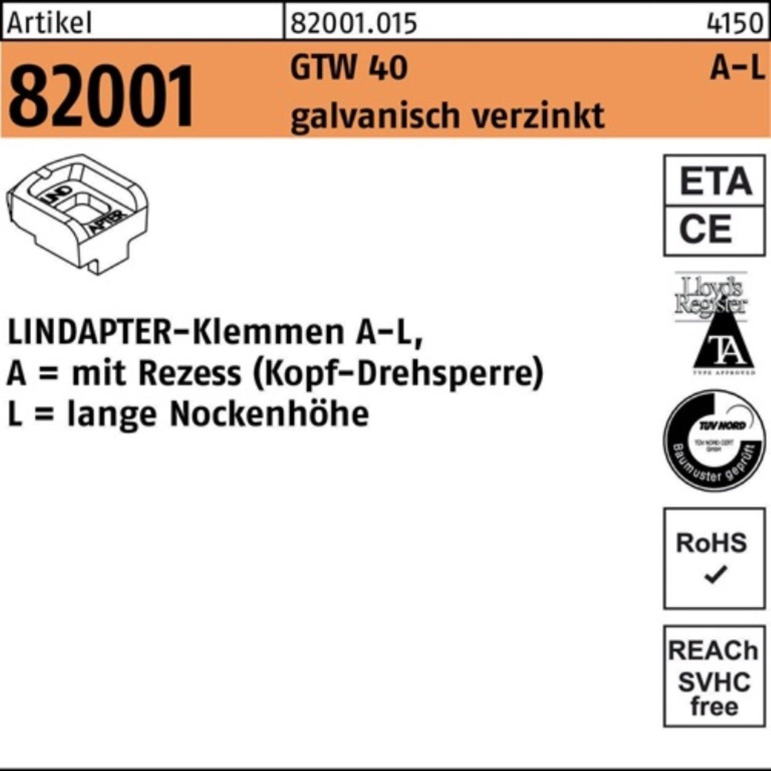 Klemmen R 82001 GTW 40 LM 16/11,0 galv.verz. 1 Stück LINDAPTER Artikel 82001 GTW 40 A-L galvanisch verzinkt LINDAPTER-Klemmen A-L mit Rezess (Kopf-Drehsperre) · lange Nockenhöhe - Abmessung: LM 16 / 11,0 VE=S (1 Stück) Впередe technische Eigenschaften: · Durchmesser: 16mm · Form: A-L · Gruppencode: 82001.015 · Norm: