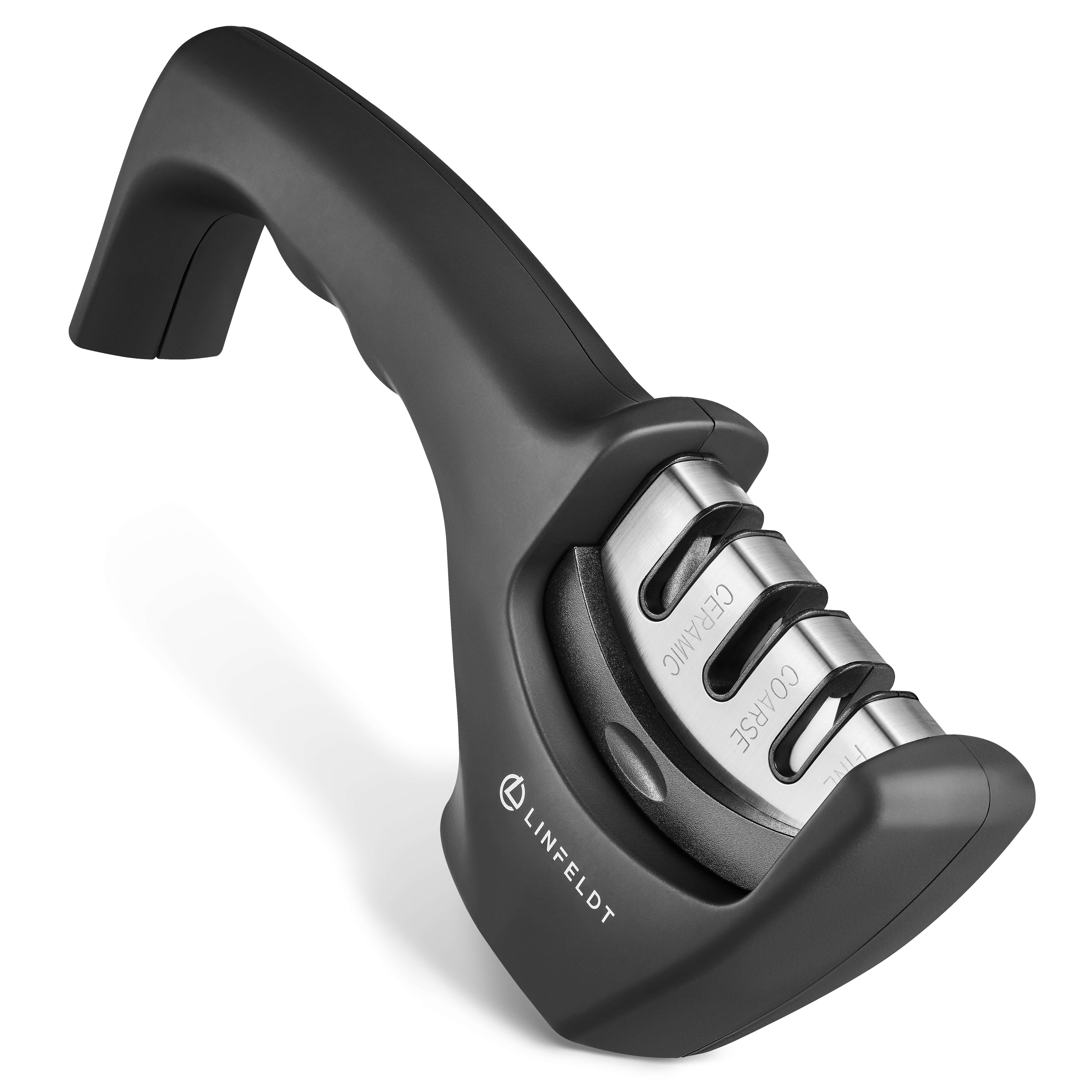 Unser manueller Messerschärfer bietet eine kinderleichte Anwendung: In 3 Stufen mit Keramikstein, Wolframcarbid und Diamant-Schleifsteinen werden Ihre Messer wie neu! Perfekt für Profi- und Küchenmesser!