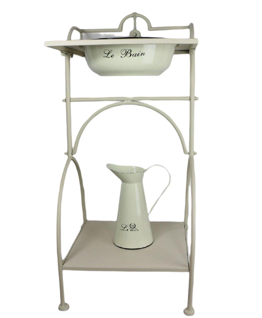 Waschtisch, Waschtischset, Badezimmertisch mit Schüssel und Kanne aus Emaille, die Schweißnähte können minimal Flugrostig sein. Der Wandtisch ist im Antikstil gearbeitet, die farbliche Fassung wirkt unterschiedlich und somit sehr antik, an den Schweißstellen kann das Gestell Flugrost ansetzen. Sie können den Tisch mit unseren zahlreichen Badezimmer Artikeln aus Emaille zusätzlich bestücken.. Das Waschtisch sieht sehr betagt aus, mit allem Pipapo was zu alten Emaille Gegenständen gehört (kleine Abplatzungen, Fehlstellen usw.) Der Artikel mit seinem antiquarischen Erscheinungsbild ist aus antikweissem emalliertem Stahlblech gefertigt. Farblich gibt es bei den Artikeln Unterchiede da wir dieses Set verschiedener Hersteller selbst zusammengestellt haben. Mit den gewünschten Gebrauchsspuren wird der Artikel zu einem Hingucker wie aus alten Zeiten. Abplatzer, Risse, Schrunden und Unebenheiten in den Oberfläche gehören zu dieser Landhausserie und sind bewusst gewollt und stellen keinen Qualitätsmangel dar.