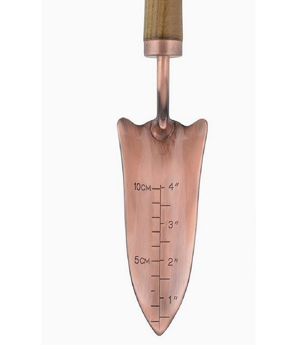 Sehr stabile Retro Pflanzen- Blumenkelle aus verkupfertem Karbonstahl, Antike Handschaufel mit Messskala. Die Materialien und die besondere Beschichtung dieses traditionellen Gartengerätes sind so gewählt, dass sie lange und zufriedenstellend ihren Zweck erfüllen. Diese verkupferte Umpflanzblumenkelle hat ein langes, schmales Blatt zum Ausstechen von Wurzelballen. Unkraut mit seinen langen Pfahlwurzeln lässt sich durch das lange Blatt im Ganzen entfernen. Auf dem Blatt befindet sich eine Messskala in Zentimeter und Inch, dadurch können Blumenzwiebeln jeweils in der richtigen Tiefe gepflanzt werden.