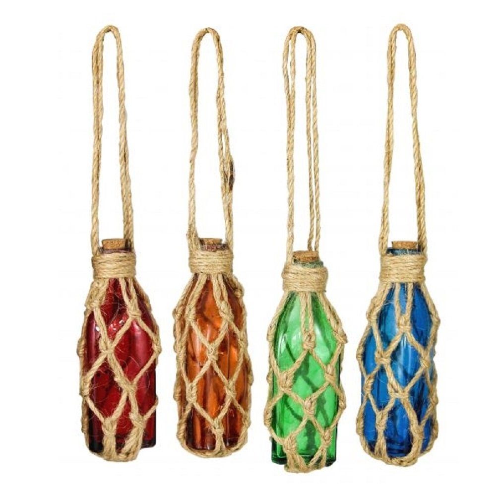 Fischerflaschen Set, 4 er Set Fischernetz Flaschen aus Glas je im Netz. Jede Flasche kann einzeln aufgehängt werden, sie bestehen aus mundgeblasenem farbigem Glas in den Farben blau/grün/amber/rot und sind jede einzelne in einem Jute Netz eingewoben. Lufteinschlüsse in den Flaschen sind Produktionsbedingt möglich und gewollt um den antiken Charme hervorzuheben.