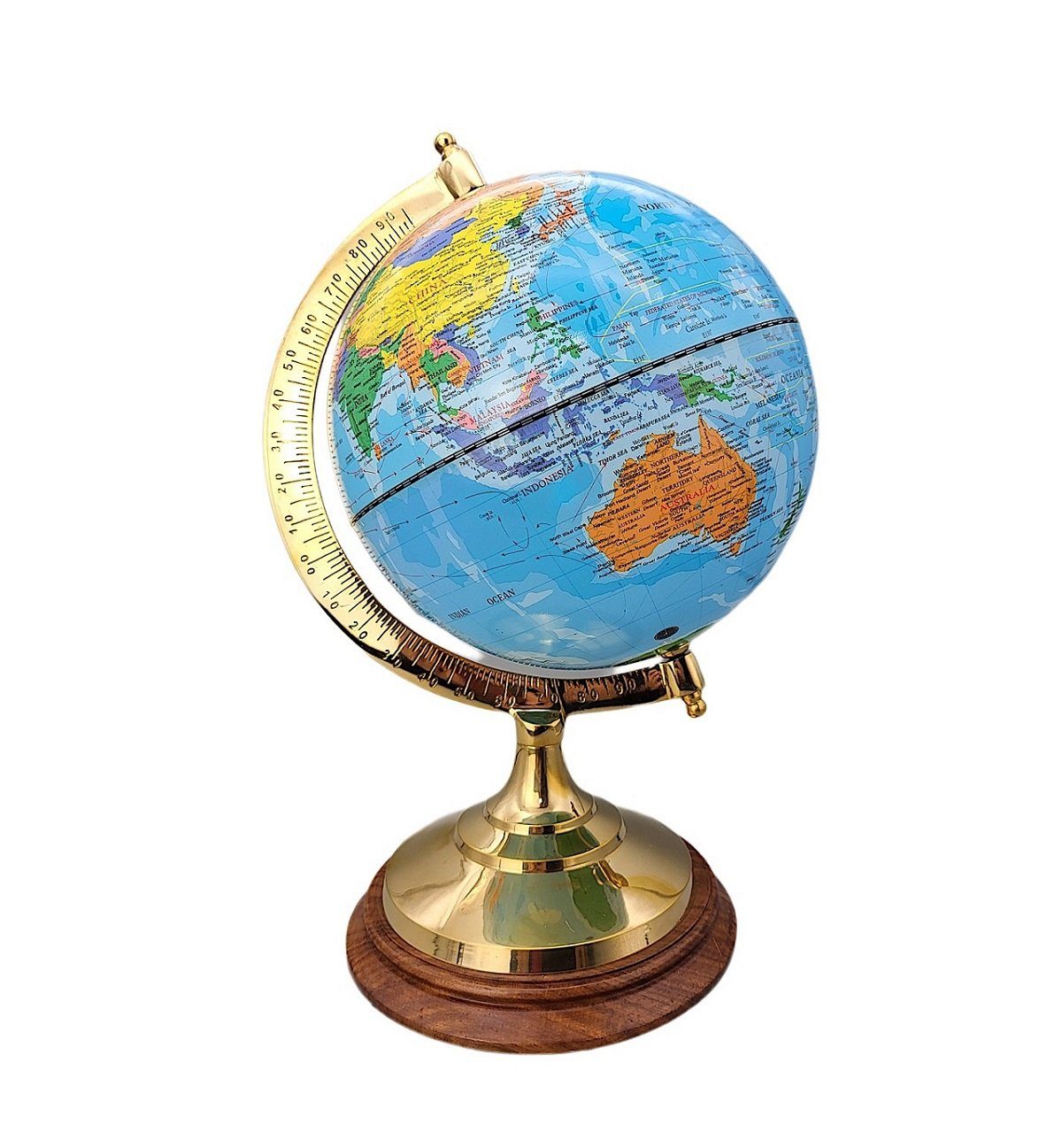 Globus mit politischem Kartenmaterial, Tischglobus mit anlaufgeschütztem Messingfuß auf einem Edelholz Sockel. Tischmodell eines klassischen Erdglobus mit englischer Beschriftung. Dieser Artikel gehört zu unseren zahlreichen Angeboten aus dem Bereich der maritimen Dekoration.