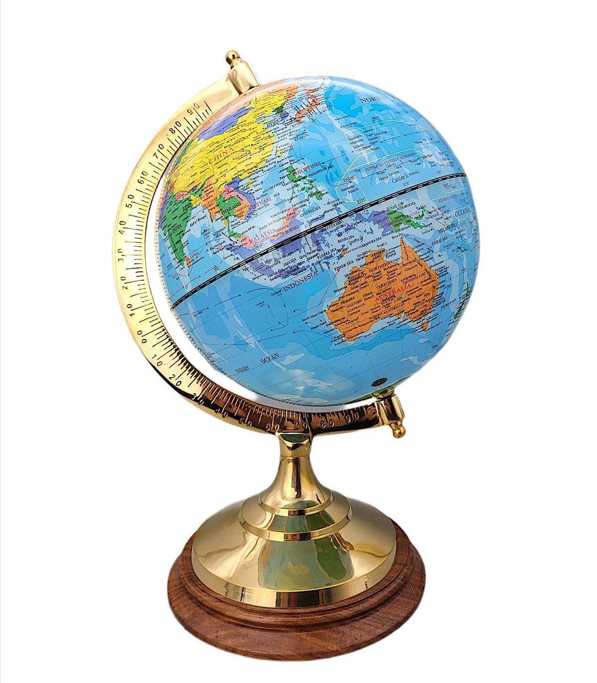 Globus mit politischem Kartenmaterial, Tischglobus mit anlaufgeschütztem Messingfuß auf einem Edelholz Sockel. Tischmodell eines klassischen Erdglobus mit englischer Beschriftung. Dieser Artikel gehört zu unseren zahlreichen Angeboten aus dem Bereich der maritimen Dekoration.
