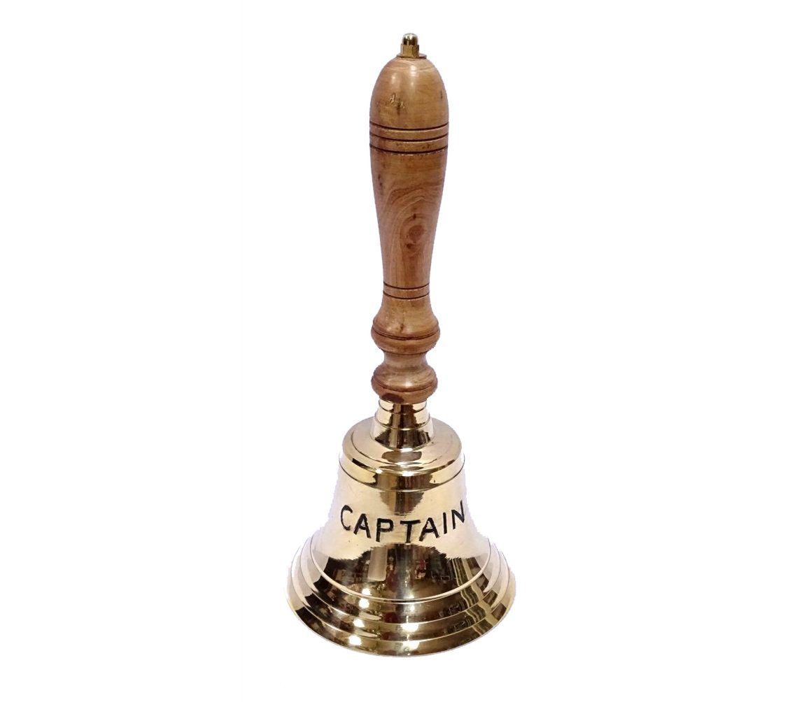 Große Handglocke, Schulglocke, Vereinsglocke, Kapitäns Glocke aus poliertem Messing mit einem Holzgriff.