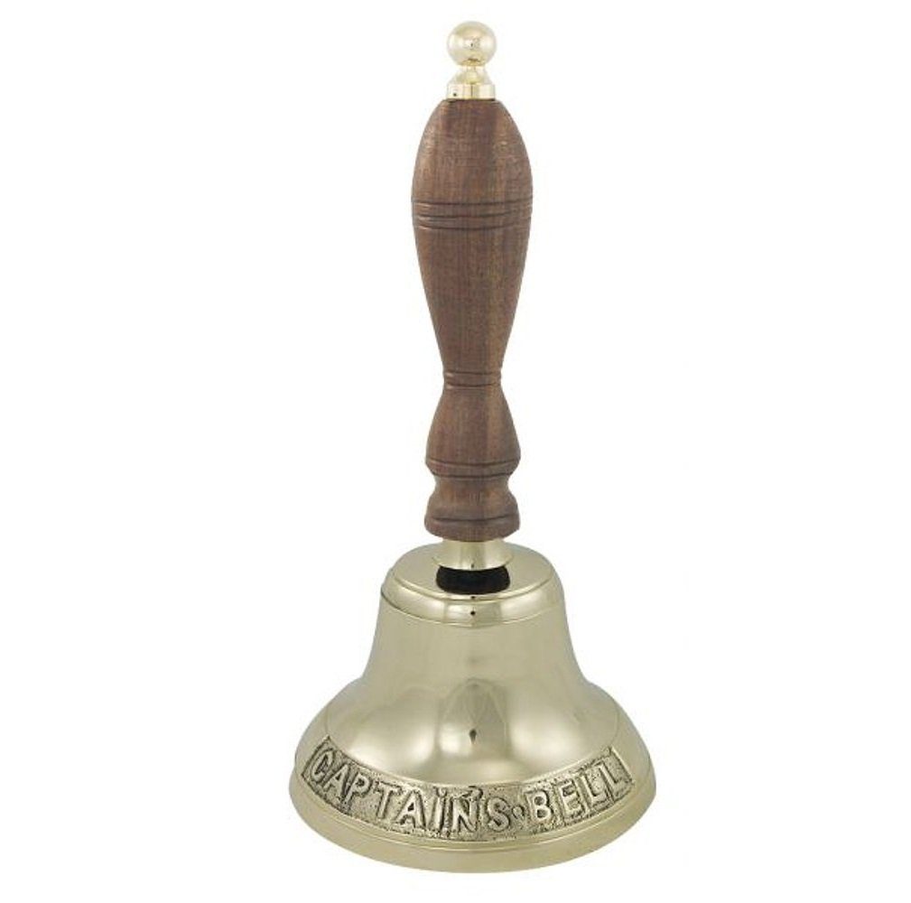 Glocke, Handglocke, Kapitänsglocke, Messing Tischglocke, maritime Glocke mit plastischer Prägung "CAPTAIN'S BELL" aus poliertem Messing mit einem Holzgriff.