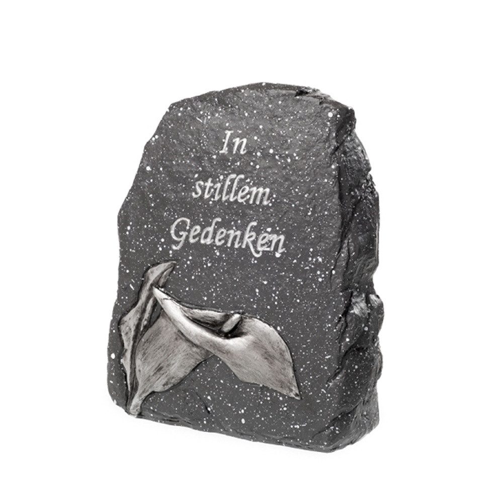 Grabdeko, Grabschmuck "Stein mit Calla" mit der Inschrift "In stillem Gedenken" wetterfester Gedenkstein in Anthrazit und Silber 15 cm. Kleiner Gedenkstein aus wetterfestem Polyresin.