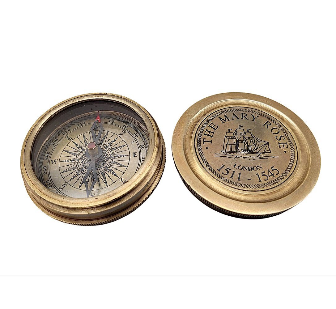 Dosenkompass "The Mary Rose", maritimer Andenken Kompass, Magnetkompass, Kompass mit Gravur, Nadelkompass aus brüniertem Messing 6 cm. Der Kompass hat ein poliertes Ziffernblatt mit arabischen Zahlen. Unsere maritimen Messinstrumente sind Repliken historischer Vorbilder und dienen vorwiegend dekorativen oder Sammlerzwecken. Dabei wurde besonderen Wert auf die Qualität und die historische Genauigkeit der Objekte, unter Verwendung hochwertiger Materialien gelegt.