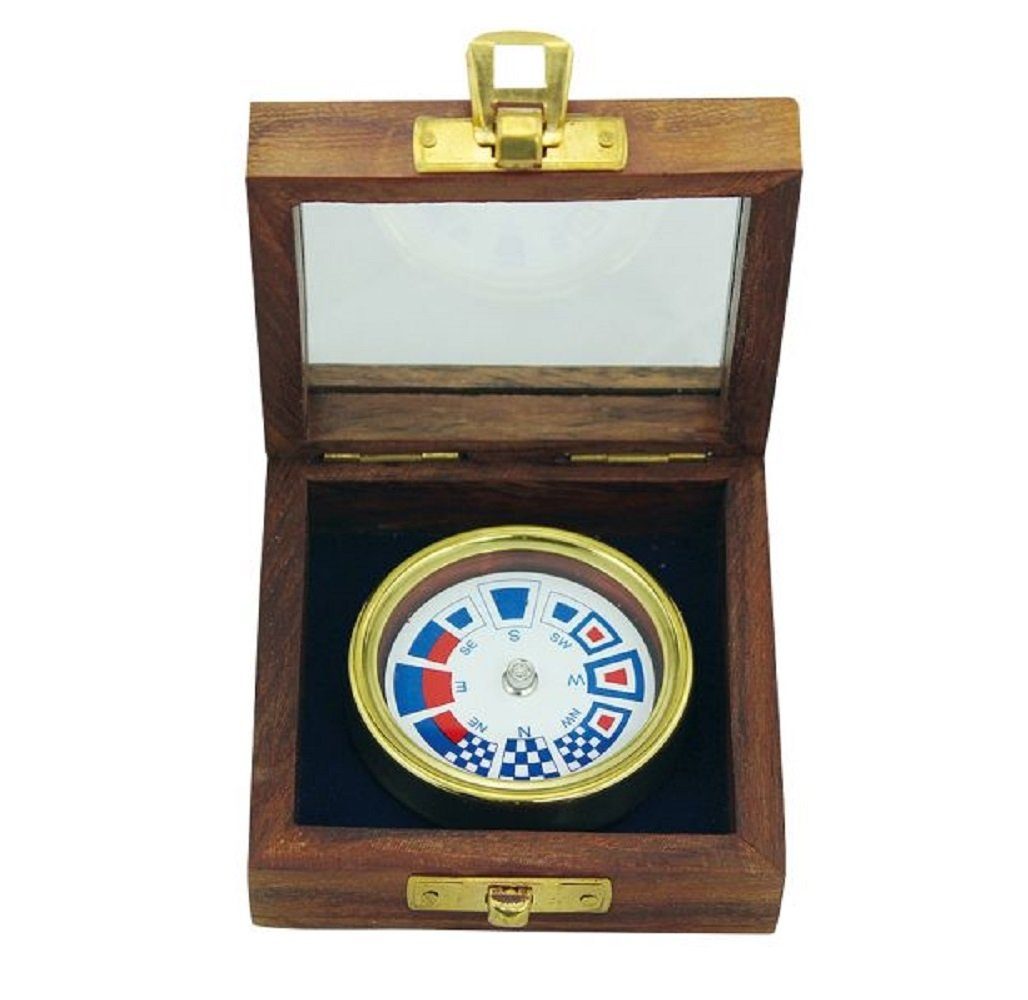Maritimer Scheibenkompass mit Flaggenzeichen, Kompass in einer Edelholzbox mit Glasdeckel. Der Kompass hat ein helles Ziffernblatt mit farbigen Flaggenzeichen. Im Gegensatz zu einem Nadelkompass dreht sich bei einem Scheibenkompass die gesamte Kompassrose. Unsere maritimen Messinstrumente sind Repliken historischer Vorbilder und dienen vorwiegend dekorativen oder Sammlerzwecken. Dabei wurde besonderen Wert auf die Qualität und die historische Genauigkeit der Objekte, unter Verwendung hochwertiger Materialien gelegt.