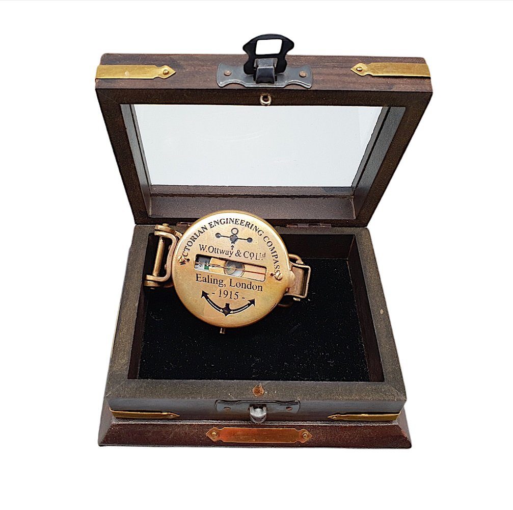 Peil- und Marschkompass WWI, Armee Kompass aus Altmessing in einer Holzbox. Der Kompass hat ein helles Ziffernblatt mit drehbarer Kompassrose und trägt die Bezeichnung W.Ottway & Co. London 1915. Es ist ein typischer Scheibenkompass, im Gegensatz zu einem Nadelkompass dreht sich bei einem Scheibenkompass die gesamte Kompassrose. Untergebracht ist diese dekorative Replik aus der Zeit des ersten Weltkrieges in einer rustikalen Holzschatulle mit Glasdeckel. Dieser reproduzierte Artikel gehört zu unseren zahlreichen Angeboten aus dem Bereich der maritimen und musealen Dekoration. Wir haben besonderen Wert auf die Qualität und die historische Genauigkeit der Objekte, unter Verwendung hochwertiger Materialien gelegt.