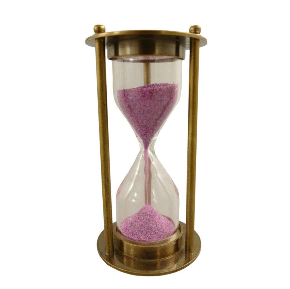 Massive antike Messing Sanduhr, Glasenuhr mit keiner Laufzeitangabe in einem gealtertem Messinggehäuse (Messing brüniert). Bei selbst durchgeführten Tests betrug die Zeit zwischen 1-3 Minuten. Daher ist diese Sanduhr ausschließlich als Dekorationsstück geeignet.