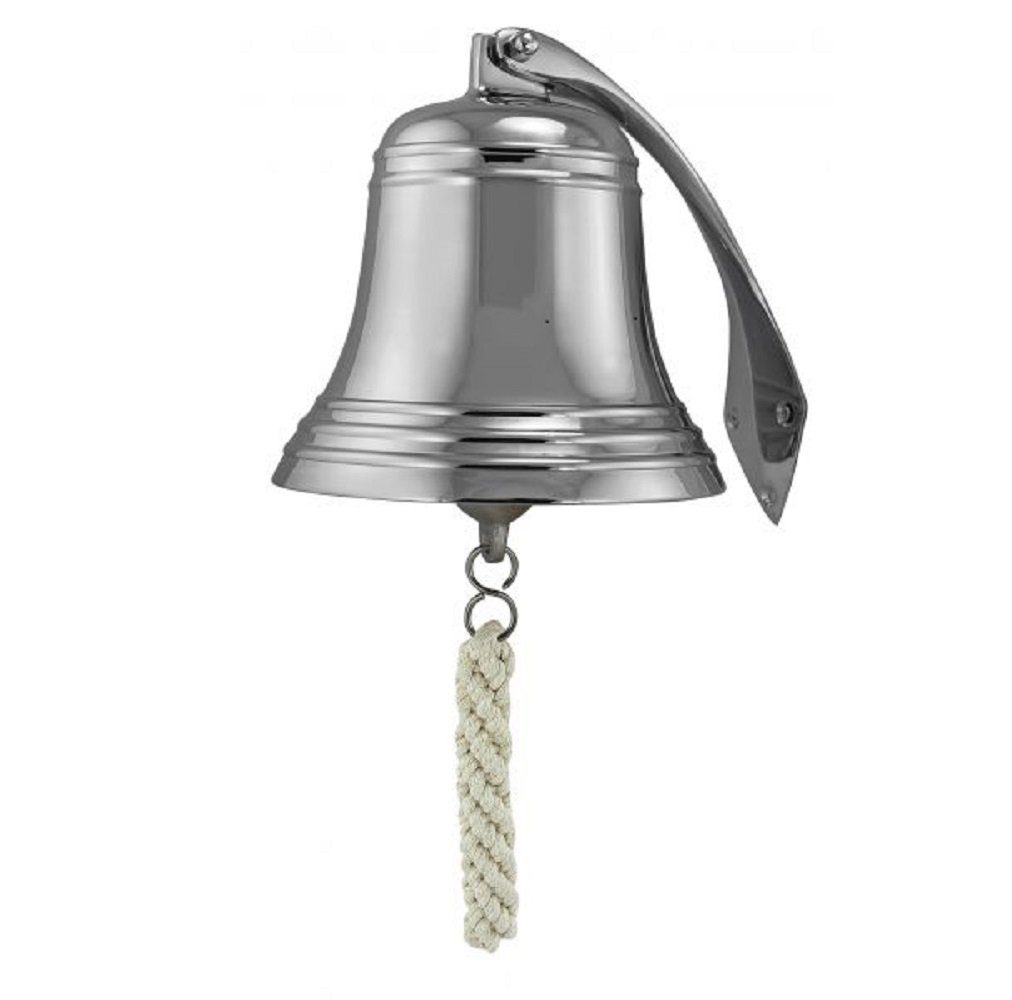 Schiffsglocke mit Wandhalter und Bändsel, schwere Wandglocke Messing vernickelt Ø 17,5 cm. Die Glocke hat einen sehr schönen Klang und gehört zur schweren Qualität. Все von uns angebotenen Schiffsglocken werden im traditionellem Sandgußverfahren hergestellt und bestehen aus massivem Messing, wahlweise sind sie auch im Anschluss brüniert oder verchromt. Sie werden alle mit Wandhalterung und Schäkel geliefert. Wenn angegeben sind sie auch mit einem Bändsel versehen. Все Glocken sind anlaufgeschützt und ersparen so unnötiges putzen. In unserem Shop haben wir zahlreiche Schiffsglocken und Glocken Zubehör. Geben Sie einfach Schiffsglocke in das Suchfeld ein