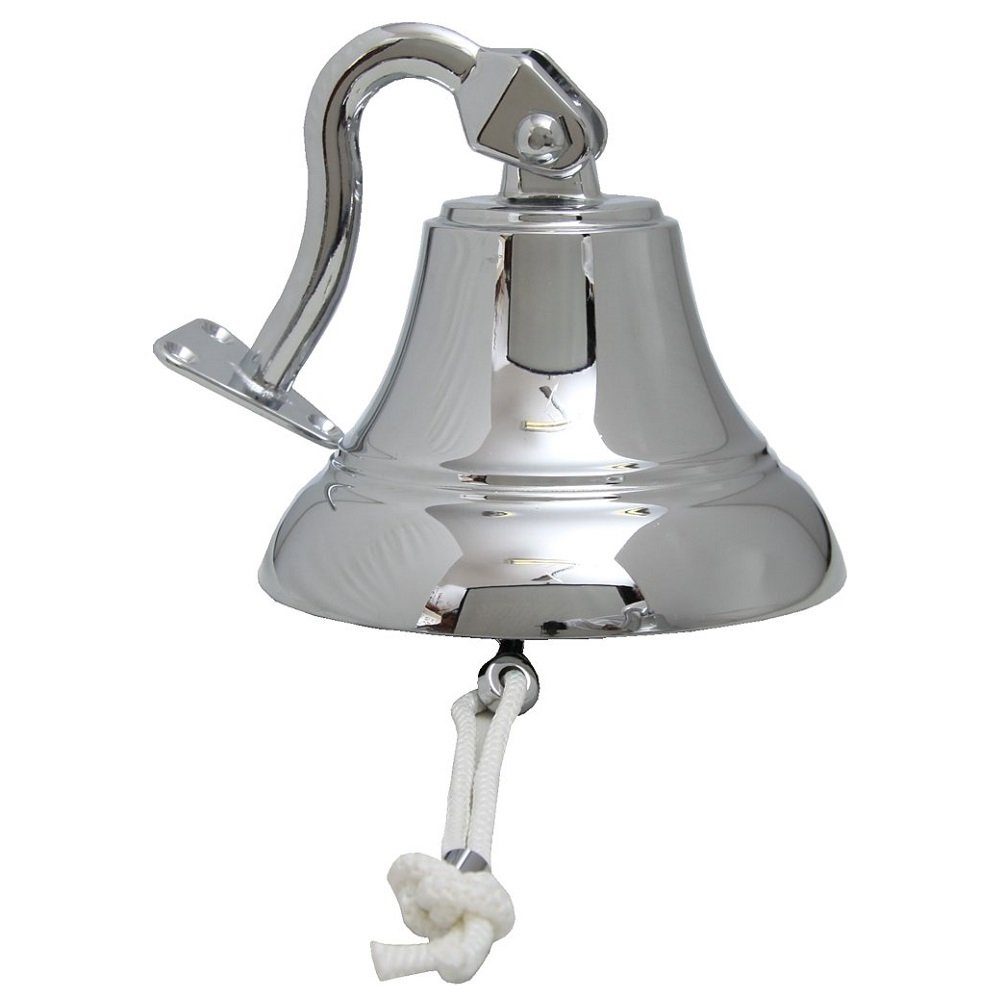 Schiffsglocke mit Wandhalter und Bändsel, Wand Glocke aus verchromten Messing Ø 15 cm. Die Glocke hat einen sehr schönen Klang und gehört zur mittelschweren Qualität. Все von uns angebotenen Schiffsglocken werden im traditionellem Sandgußverfahren hergestellt und bestehen aus massivem Messing, wahlweise sind sie auch im Anschluss brüniert oder verchromt. Sie werden alle mit Wandhalterung und Schäkel geliefert. Wenn angegeben sind sie auch mit einem Bändsel versehen. Все Glocken sind anlaufgeschützt und ersparen so unnötiges putzen. In unserem Shop haben wir zahlreiche Schiffsglocken und Glocken Zubehör. Geben Sie einfach Schiffsglocke in das Suchfeld ein
