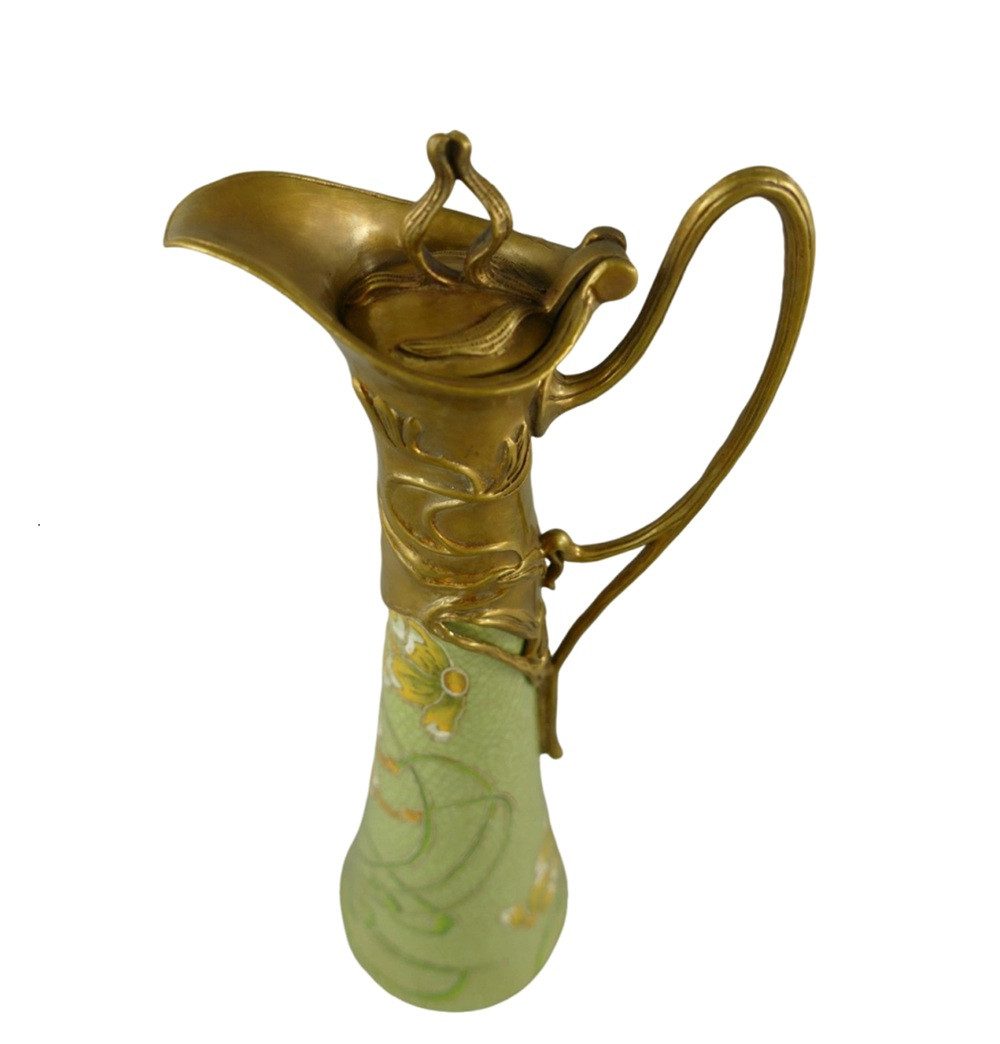 Jugendstil Keramik Kanne, Deckelkanne mit floraler Bronzemontierung. Die Kanne ist aus Porzellan und von Hand kunstvoll, floral Unterglasur bemalt. Die Oberfläche ist reichlich Craquelé glasiert und verleiht ihr dadurch einen besonderen Charme. Oberhalb und am Griff ist das Objekt mit einer Bronzemontage versehen. Die Kanne steht im Stil französischer Art Nouveau Kannen aus der Zeit um 1910.