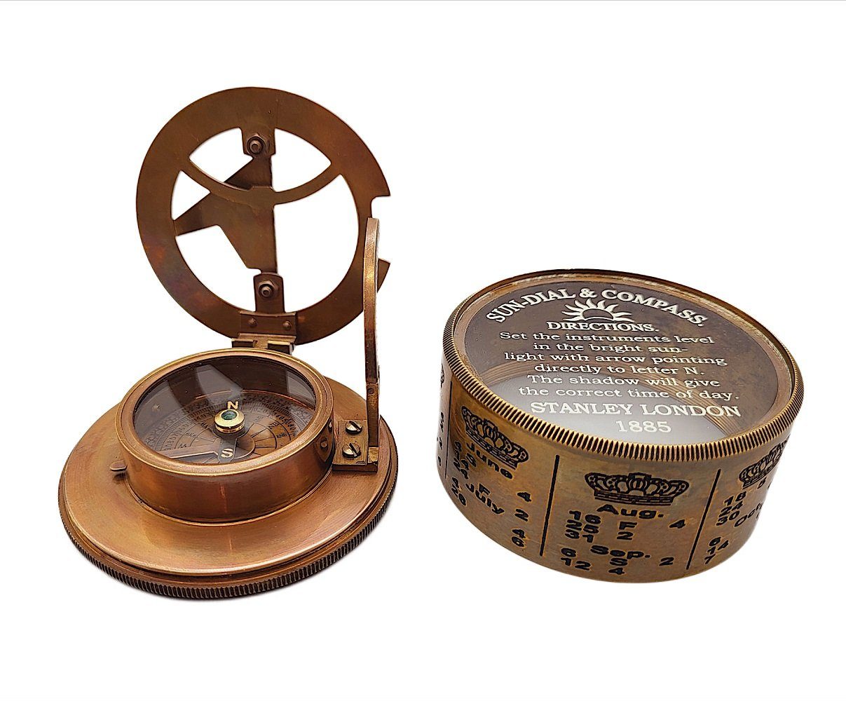 Sundial Dosenkompass, Sonnenuhren Kompass, Marine Kompass, Altmessing. Dieser Kompass ist allseitig fein graviert. Unsere maritimen Messinstrumente sind Repliken historischer Vorbilder und dienen vorwiegend dekorativen oder Sammlerzwecken. Dabei wurde besonderen Wert auf die Qualität und die historische Genauigkeit der Objekte, unter Verwendung hochwertiger Materialien gelegt.