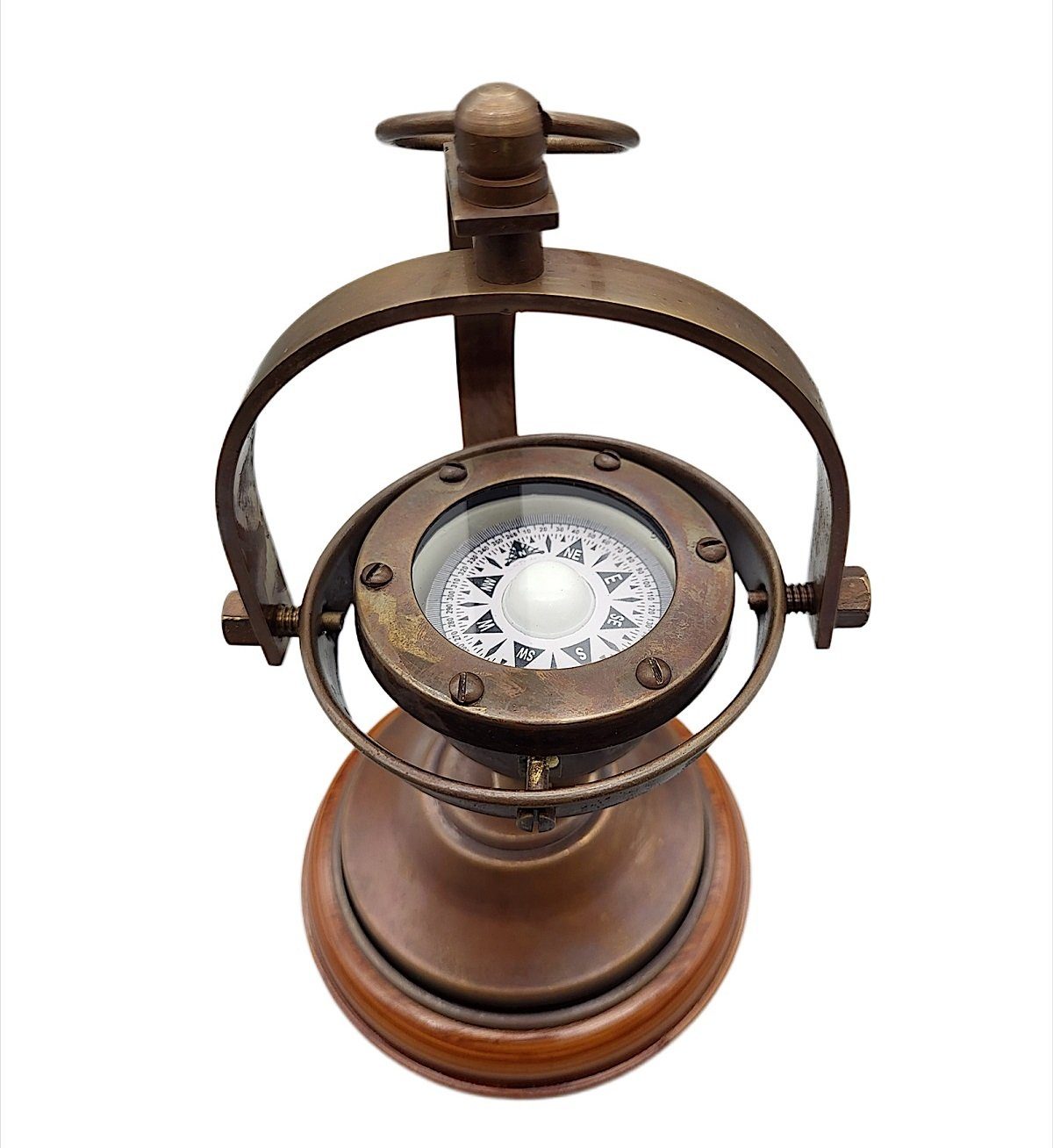 Nautischer Kompass, Scheibenkompass mit kardanischer Aufhängung. Der Kompass ist mit einer kardanischen Aufhängung ausgerüstet und dreht sich somit in jede gewünschte Position. Im Gegensatz zu einem Nadelkompass dreht sich bei einem Scheibenkompass die gesamte Kompassscheibe. Das Kompass Gehäuse ist aus Altmessing gefertigt und auf einem edlen Holzsockel montiert. Unsere maritimen Messinstrumente sind Repliken historischer Vorbilder und dienen vorwiegend dekorativen oder Sammlerzwecken. Dabei wurde besonderen Wert auf die Qualität und die historische Genauigkeit der Objekte, unter Verwendung hochwertiger Materialien gelegt. Mögliche eingearbeitete Gebrauchsspuren sorgen für den rustikalen Charme unserer Produkte und sollen deren nostalgisches Aussehen unterstreichen.